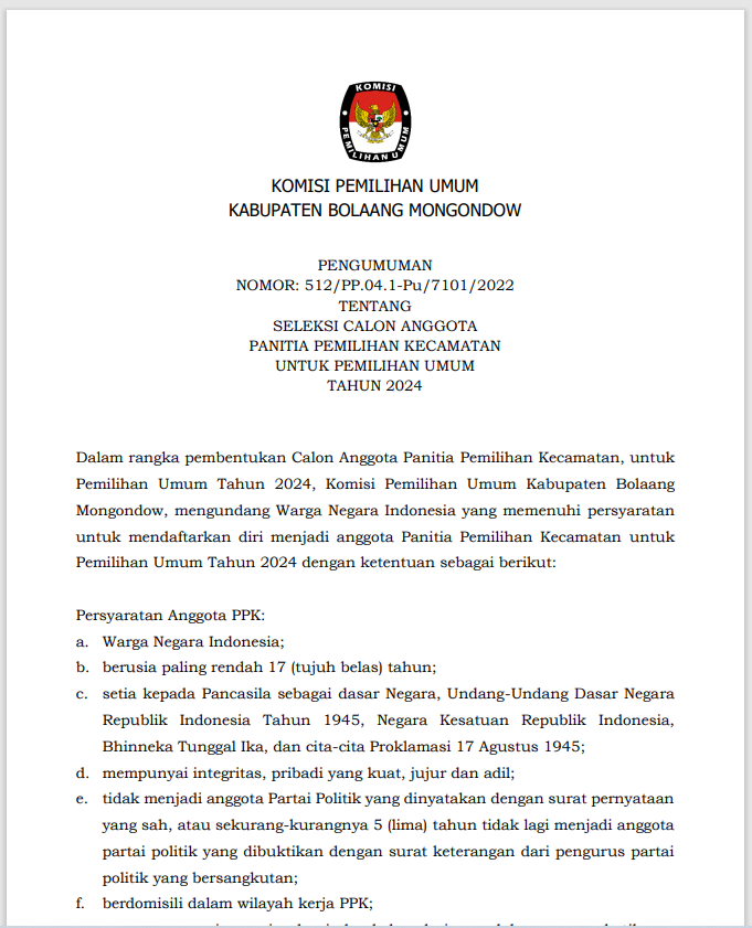 Dalam rangka pembentukan Calon Anggota Panitia Pemilihan Kecamatan, untuk Pemilihan Umum Tahun 2024, Komisi Pemilihan Umum Kabupaten Bolaang Mongondow, mengundang Warga Negara Indonesia yang memenuhi persyaratan untuk mendaftarkan diri menjadi anggota Panitia Pemilihan Kecamatan untuk Pemilihan Umum Tahun 2024 dengan ketentuan sebagai berikut: