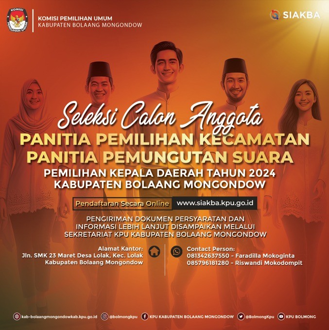 Dalam rangka pembentukan Calon Anggota Panitia Pemilihan Kecamatan untuk Pemilihan Gubernur dan Wakil Gubernur, Bupati dan Wakil Bupati, dan Wali Kota dan Wakil Wali Kota Tahun 2024, Komisi Pemilihan Umum Kabupaten Bolaang Mongondow mengundang Warga Negara Indonesia yang memenuhi kualifikasi untuk mendaftarkan diri menjadi Panitia Pemilihan Kecamatan untuk Pemilihan Gubernur dan Wakil Gubernur, Bupati dan Wakil Bupati, dan Wali Kota dan Wakil Wali Kota.