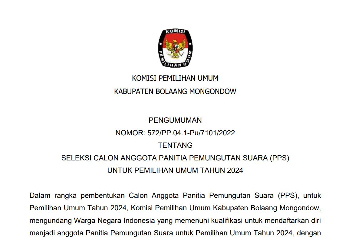 Lolak, kab-bolaangmongondow.go.id - Dalam rangka pembentukan Calon Anggota Panitia Pemungutan Suara (PPS), untuk Pemilihan Umum Tahun 2024, Komisi Pemilihan Umum Kabupaten Bolaang Mongondow, mengundang Warga Negara Indonesia yang memenuhi kualifikasi untuk mendaftarkan diri menjadi anggota Panitia Pemungutan Suara untuk Pemilihan Umum Tahun 2024, dengan ketentuan sebagai berikut: