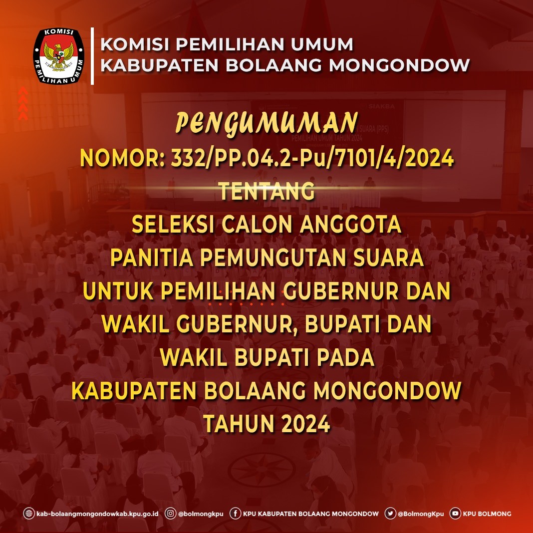 Dalam rangka pembentukan Calon Anggota Panitia Pemungutan Suara untuk Pemilihan Gubernur dan Wakil Gubernur, Bupati dan Wakil Bupati, dan Wali Kota dan Wakil Wali Kota Tahun 2024, Komisi Pemilihan Umum Kabupaten Bolaang Mongondow mengundang Warga Negara Indonesia yang memenuhi kualifikasi untuk mendaftarkan diri menjadi Panitia Pemungutan Suara untuk Pemilihan Gubernur dan Wakil Gubernur, Bupati dan Wakil Bupati, dan Wali Kota dan Wakil Wali Kota.