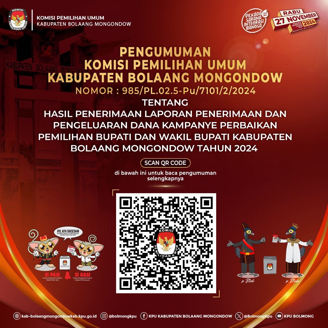PENGUMUMAN TENTANG HASIL PENERIMAAN LAPORAN PENERIMAAN DAN PENGELUARAN DANA KAMPANYE PERBAIKAN PEMILIHAN BUPATI DAN WAKIL BUPATI BOLAANG MONGONDOW TAHUN 2024