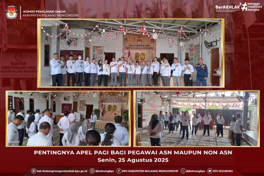 Lolak, kab-bolaangmongondow.kpu.go.id, mengikuti apel pagi di setiap awal pekan merupakan kewajiban bagi setiap pegawai baik ASN maupun Non ASN. Hal ini ditegaskan oleh Sekretaris KPU Kabupaten Bolaang Mongondow (Bolmong) dalam Apel Pagi Senin 25 Agustus 2025. Apel pagi juga sebagai sarana untuk menyampaikan informasi-informasi di lembaga yang harus segera ditindaklanjuti dalam selang minggu berjalan. Beliau juga menekankan keterlibatan aktif semua pegawai dalam pelaksanaan agenda-agenda yang ditetapkan serta penyebaran informasi kelembagaan melalui media sosial.