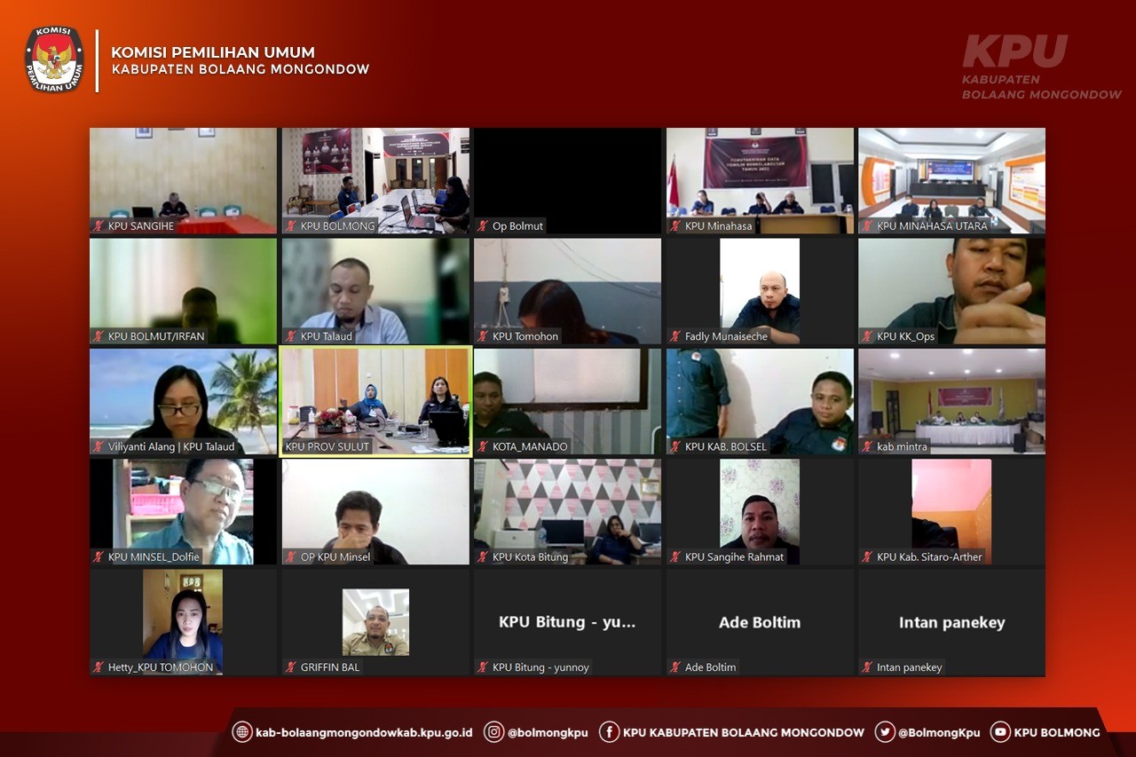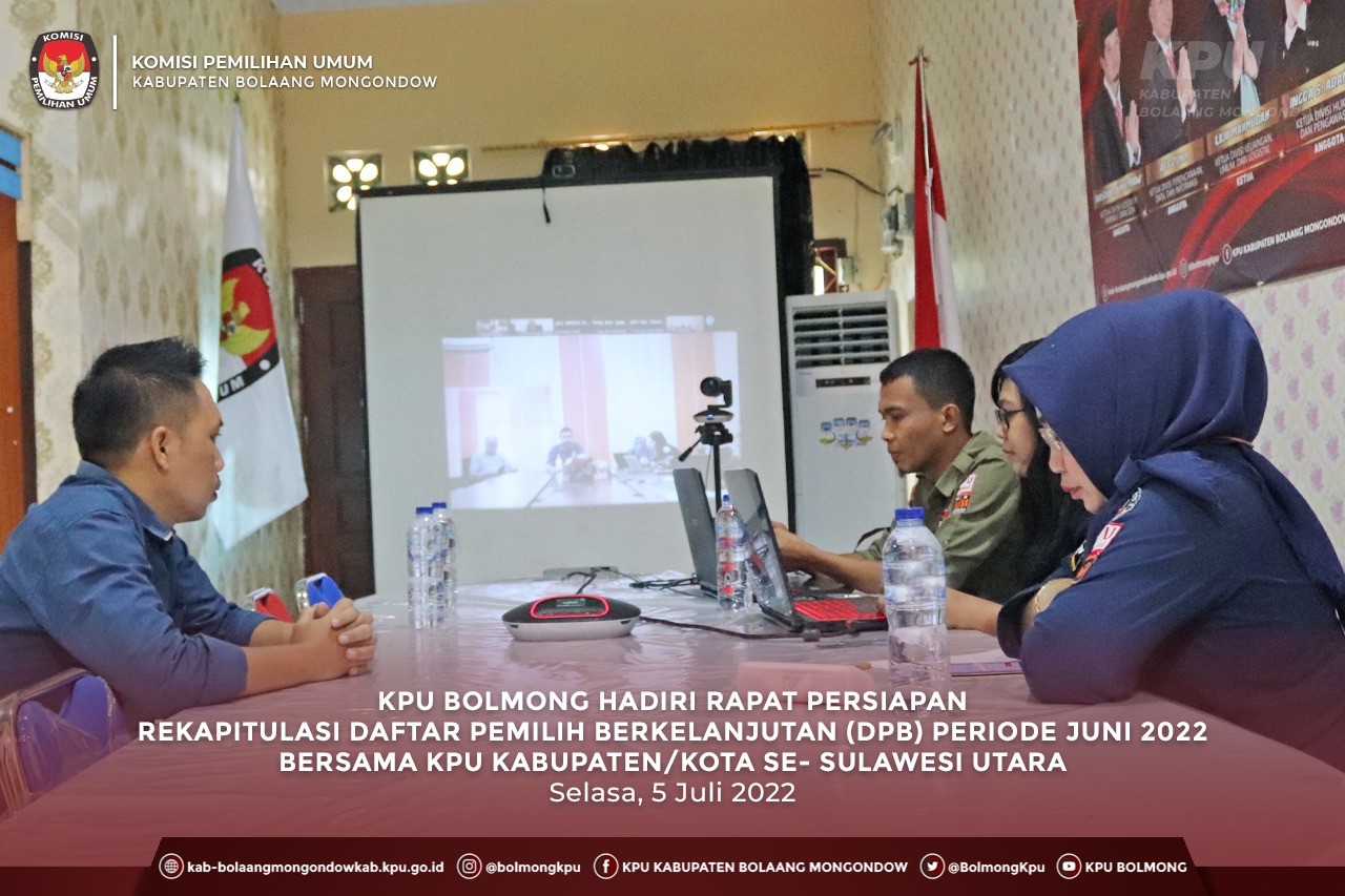 Lolak, kab-bolaangmongondow.kpu.go.id - KPU Kabupaten Bolaang Mongondow mengikuti Rapat Persiapan Rekapitulasi Daftar Pemilih Berkelanjutan (DPB) Periode Bulan Juni Tahun 2022 yang diselenggarakan oleh KPU Provinsi Sulawesi Utara, sesuai surat undangan KPU Provinsi Sulawesi Utara Nomor : 197/TIK.04-Und/71/2022, kegiatan yang dilaksanakan secara daring ini diikuti oleh Ketua Divisi Perencanaan, Data dan Informasi, Kasubag Divisi Perencanaan, Data dan Informasi serta Operator Sidalih Kabupaten/Kota Se-Sulawesi Utara.