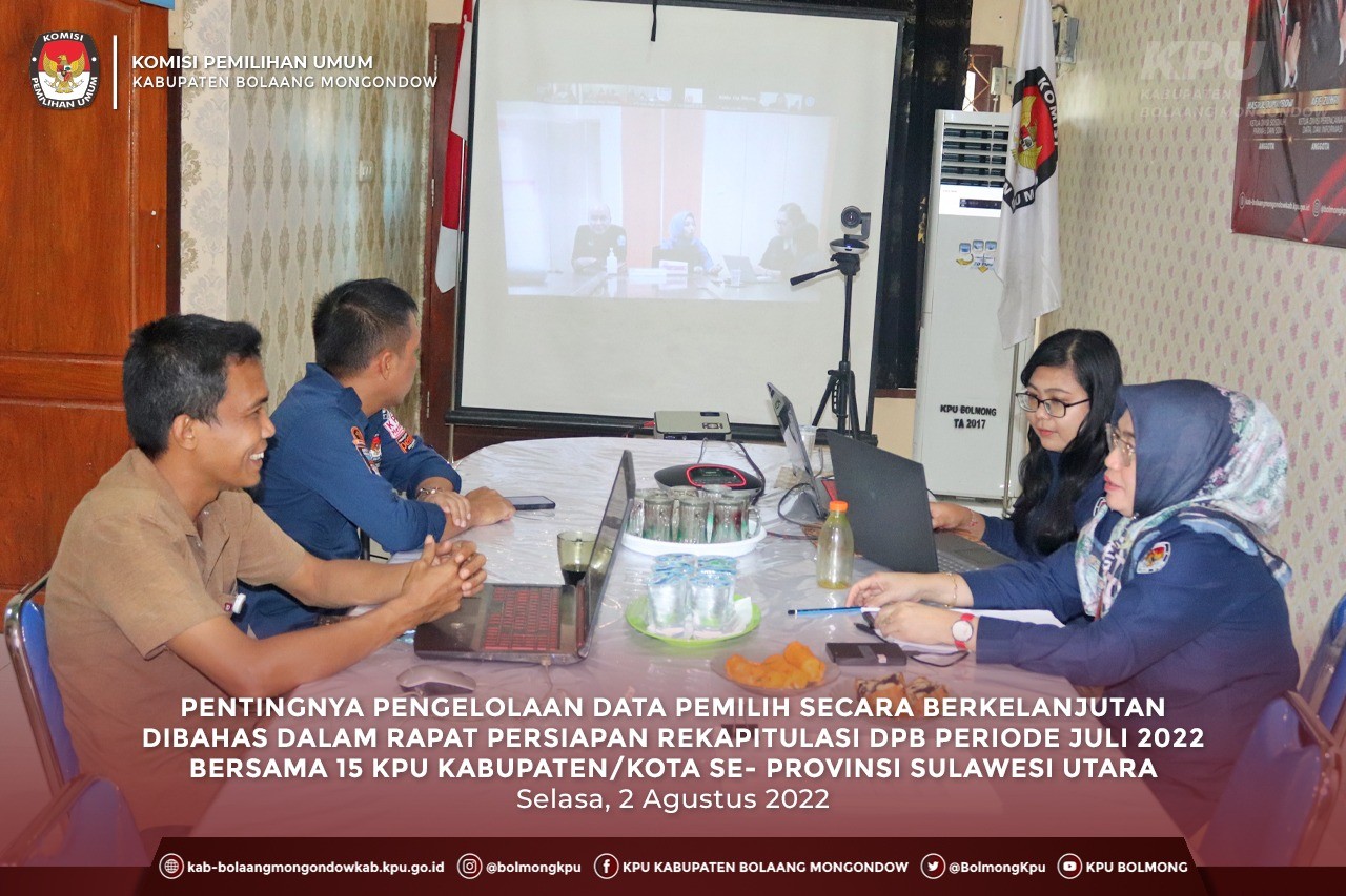 Lolak, kab-bolaangmongondow.kpu.go.id - KPU Kabupaten Bolaang Mongondow mengikuti Rapat Persiapan Rekapitulasi Daftar Pemilih Berkelanjutan (DPB) Periode Bulan Juli Tahun 2022 yang diselenggarakan oleh KPU Provinsi Sulawesi Utara, sesuai surat undangan KPU Provinsi Sulawesi Utara Nomor : 244/TIK.04-Und/71/2022, kegiatan yang dilaksanakan secara daring ini diikuti oleh Ketua Divisi Perencanaan, Data dan Informasi, Kasubag Perencanaan, Data dan Informasi serta Operator Sidalih Kabupaten/Kota Se-Sulawesi Utara.
