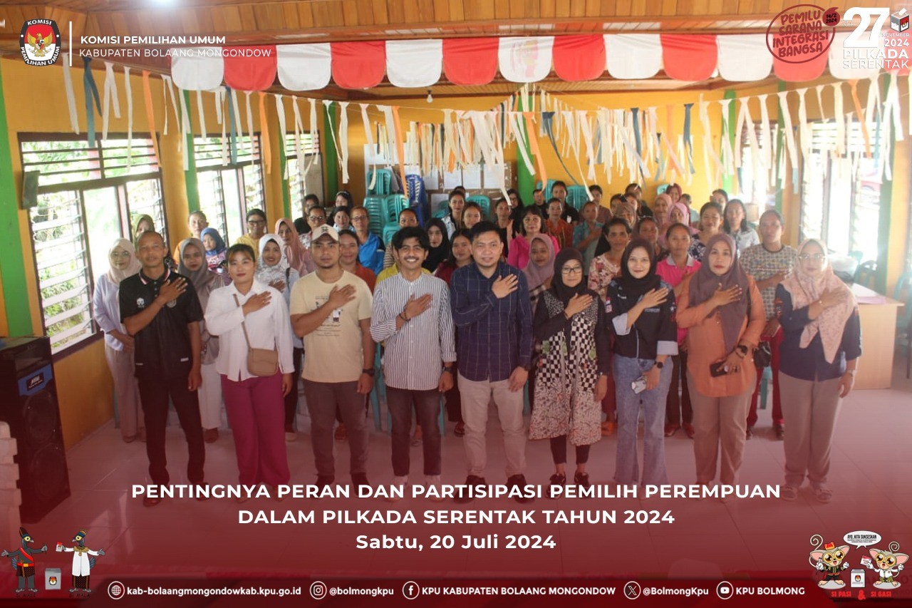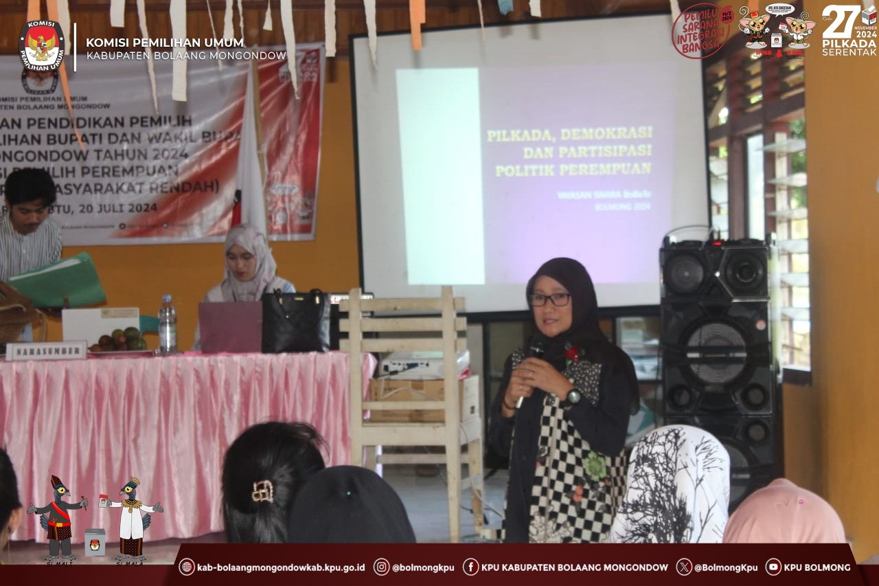 Anggota KPU Bolmong, Jalaludin Koesasi pada kesempatannya saat membuka kegiatan ini menyampaikan bahwa sebagaimana data tingkat partisipasi pemilih perempuan pada Pemilu 2024, tercatat dari 3 kecamatan yang tingkat partisipasi pemilih perempuan rendah, salah satunya di Kecamatan Dumoga Utara. Beliau berharap melalui sosdiklih ini dapat mendongkrak tingkat partisipasi pemilih perempuan pada pelaksanaan Pilkada Serentak Tahun 2024 nanti.