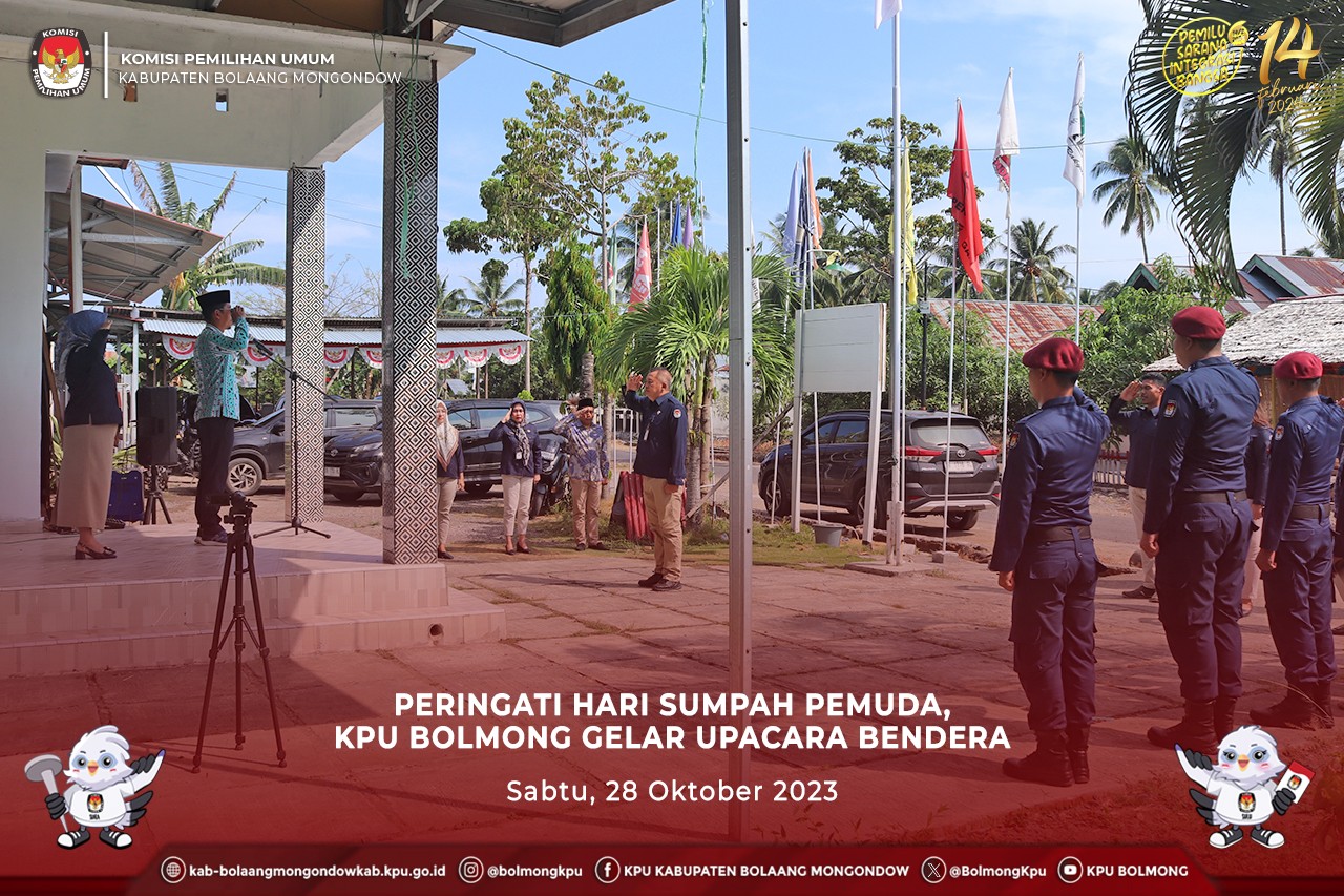 Lolak, kab-bolaangmongondow.kpu.go.id - KPU Kabupaten Bolaang Mongondow (Bolmong) menggelar Upacara Peringatan Hari Sumpah Pemuda dengan tema "Bersama Majukan Indonesia". Bertindak sebagai Pemimpin Upacara, Kepala Sub Bagian Keuangan, Umum dan Logistik Meydi Wolah, dan selaku Pembina Upacara, Plh Ketua KPU Bolmong, Ingga S. Adampe, Sabtu (28/10/23).