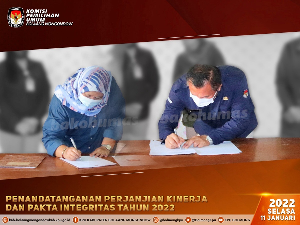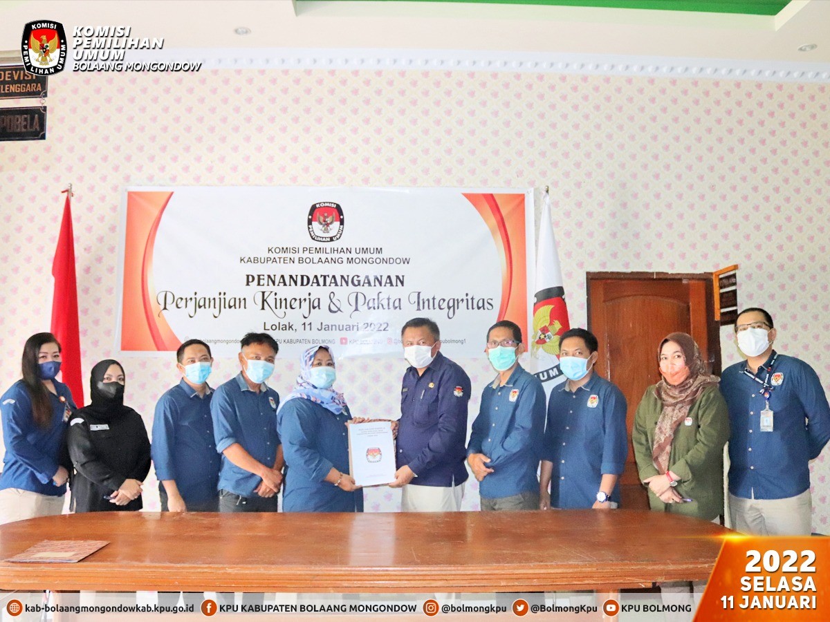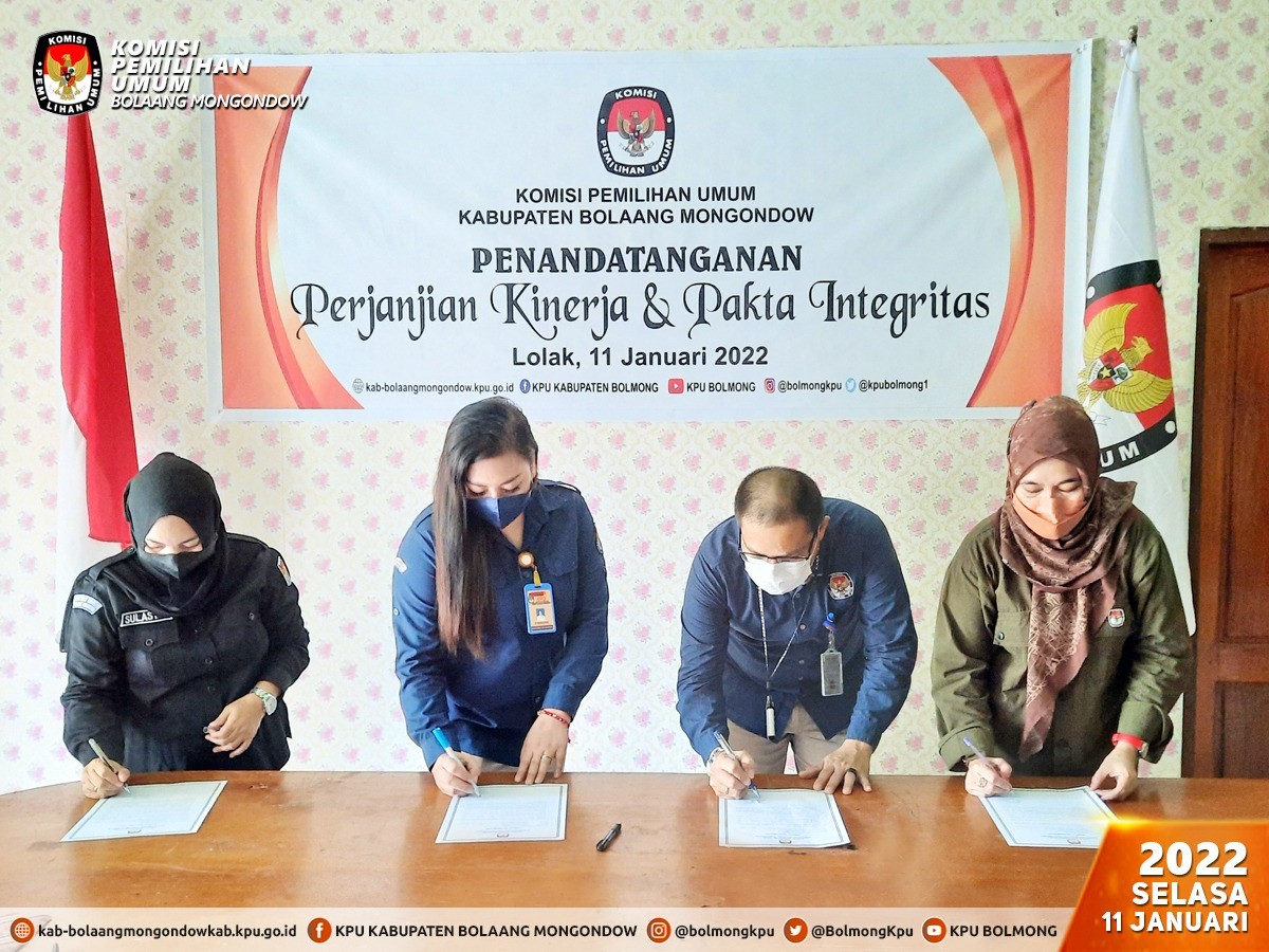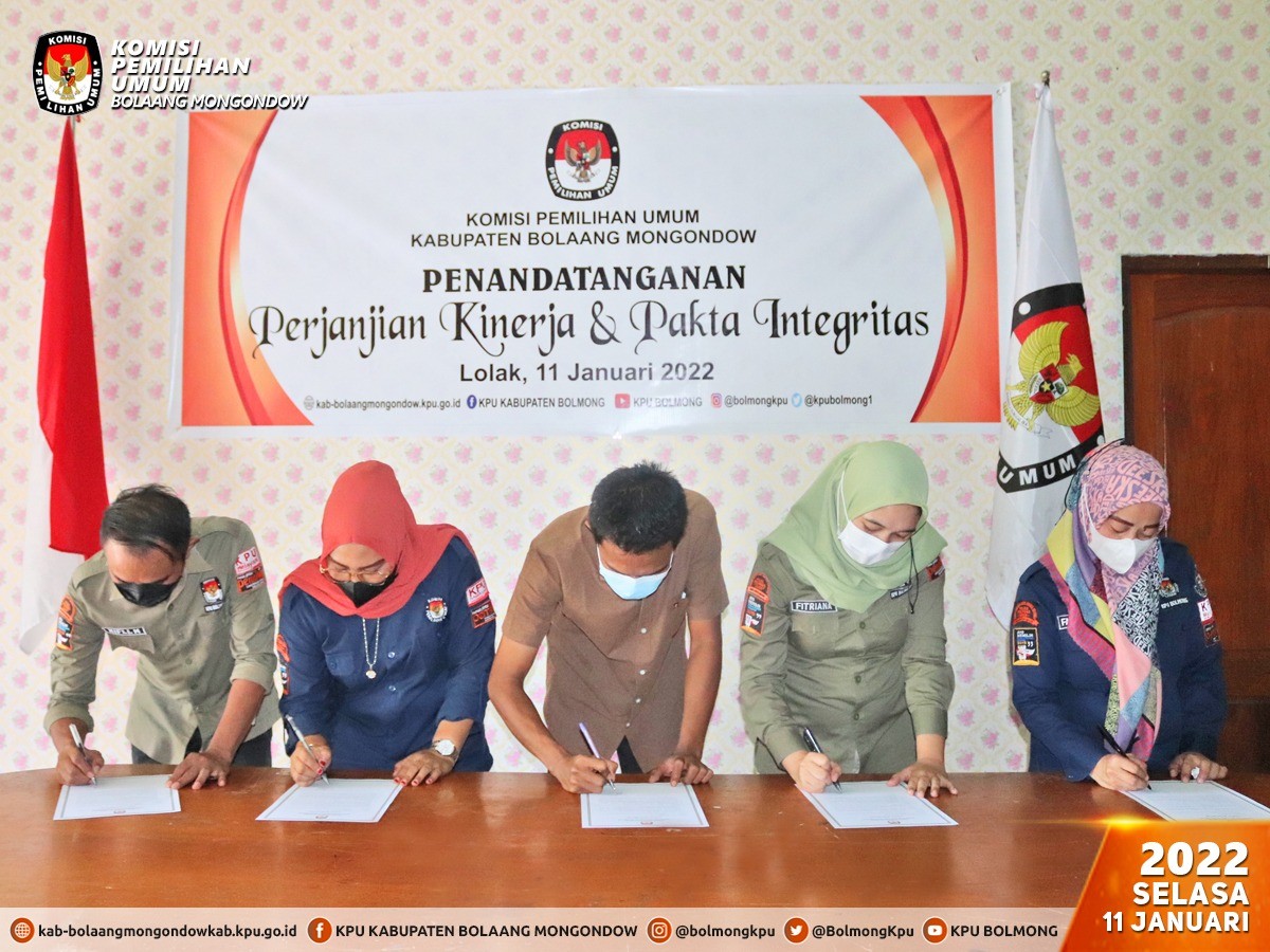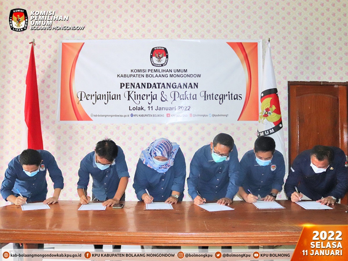 Lolak, Bolmong, kab-bolaangmongondow.kpu.go.id - Dalam rangka mewujudkan manajemen pemerintahan yang efektif, transparan dan akuntabel serta berorientasi pada hasil, maka KPU Kabupaten Bolaang Mongondow telah melaksanakan Penandatanganan Perjanjian Kinerja dan Pakta Integritas Tahun 2022 pada Selasa (11/1).