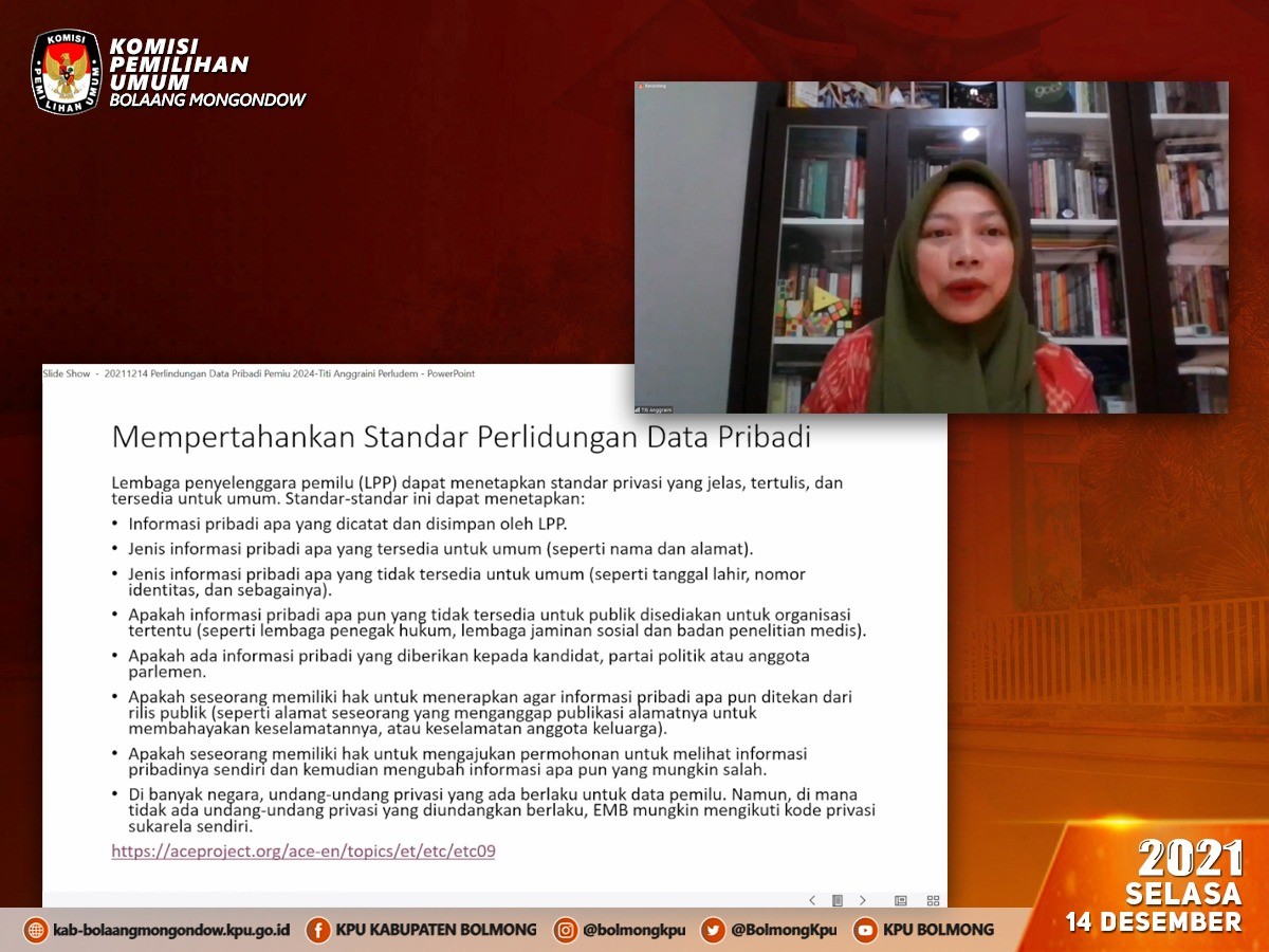 Selanjutnya narasumber kedua yaitu Dewan Pembina Perkumpulan untuk Pemilu dan Demokrasi (Perludem), Titi Anggraini yang mengulas isu-isu perlindungan data pribadi pada Pemilu tahun 2024 mendatang.