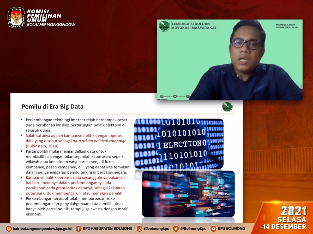 Hadir sebagai narasumber pertama Direktur Eksekutif Lembaga Studi dan Advokasi Masyarakat (Elsam) Wahyudi Djafar yang memaparkan data pribadi dalam konteks penyelenggaraan Pemilu dan kemudian apa saja tantangannya serta langkah-langkah antisipatif yang dapat disiapkan oleh KPU maupun penyelenggara Pemilu secara keseluruhan untuk memastikan perlindungan data pribadi Pemilih dalam situasi kesenjangan legislasi perlindungan data pribadi di Indonesia.