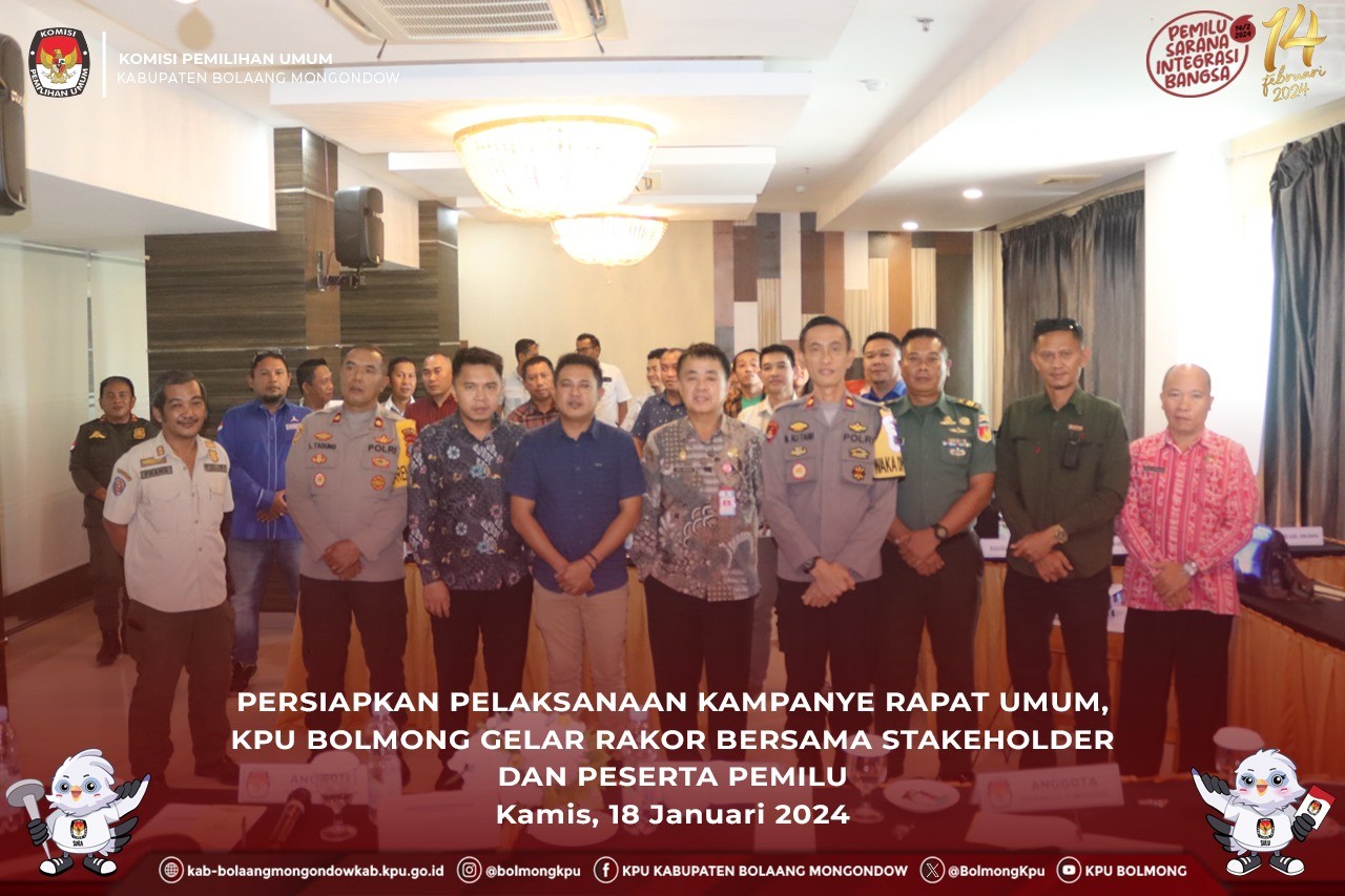 Lolak, kab-bolaangmongondow.kpu.go.id - Komisi Pemilihan Umum (KPU) Kabupaten Bolaang Mongondow (Bolmong) menggelar Rapat Koordinasi Persiapan Pelaksanaan Kampanye Rapat Umum pada Pemilihan Umum Serentak Tahun 2024, Kamis (18/1/2024).