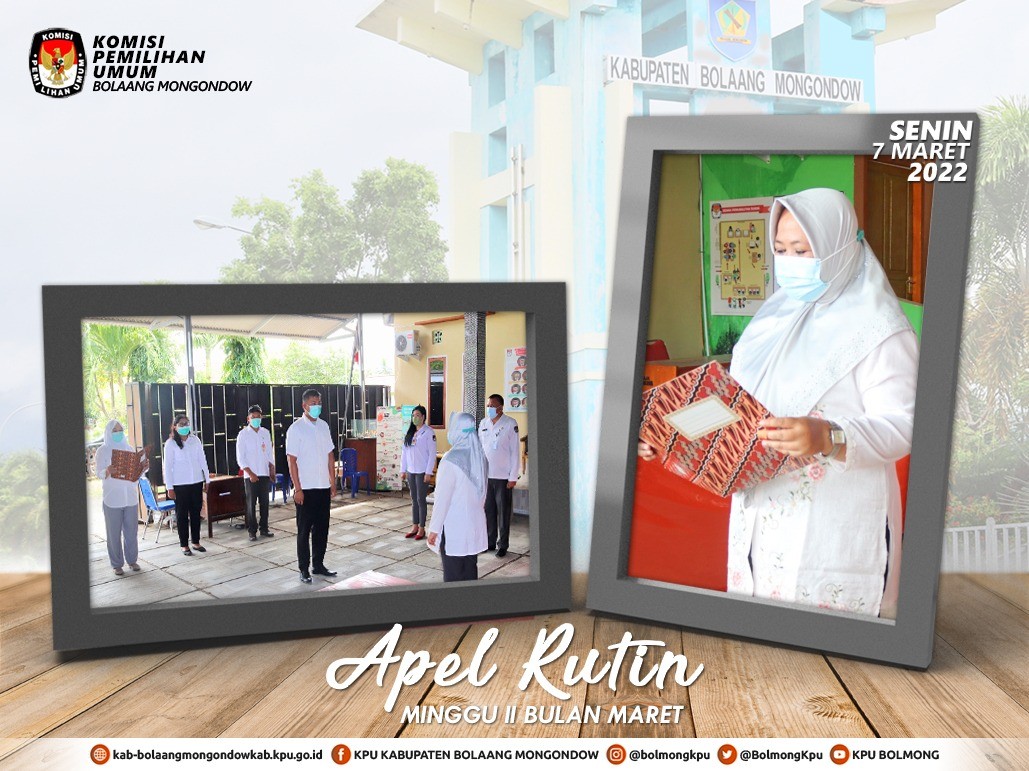 Lolak, kab-bolaangmongondow.kpu.go.id - Bertempat di halaman kantor Komisi Pemilihan Umum (KPU) Kabupaten Bolaang Mongondow kembali digelar Apel Pagi Rutin Minggu II Maret yang diikuti oleh pejabat dan pegawai di lingkungan KPU Kabupaten Bolaang Mongondow.