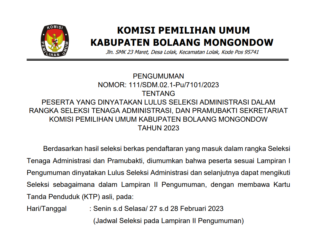 Lolak, kab-bolaangmongondow.kpu.go.id - Berdasarkan hasil seleksi berkas pendaftaran yang masuk dalam rangka Seleksi Tenaga Administrasi dan Pramubakti, maka KPU Kabupaten Bolaang Mongondow telah mengumumkan Peserta Yang Dinyatakan Lulus Seleksi Administrasi Dalam Rangka Seleksi Tenaga Administrasi, Dan Pramubakti Sekretariat Komisi Pemilihan Umum Kabupaten Bolaang Mongondow Tahun 2023.