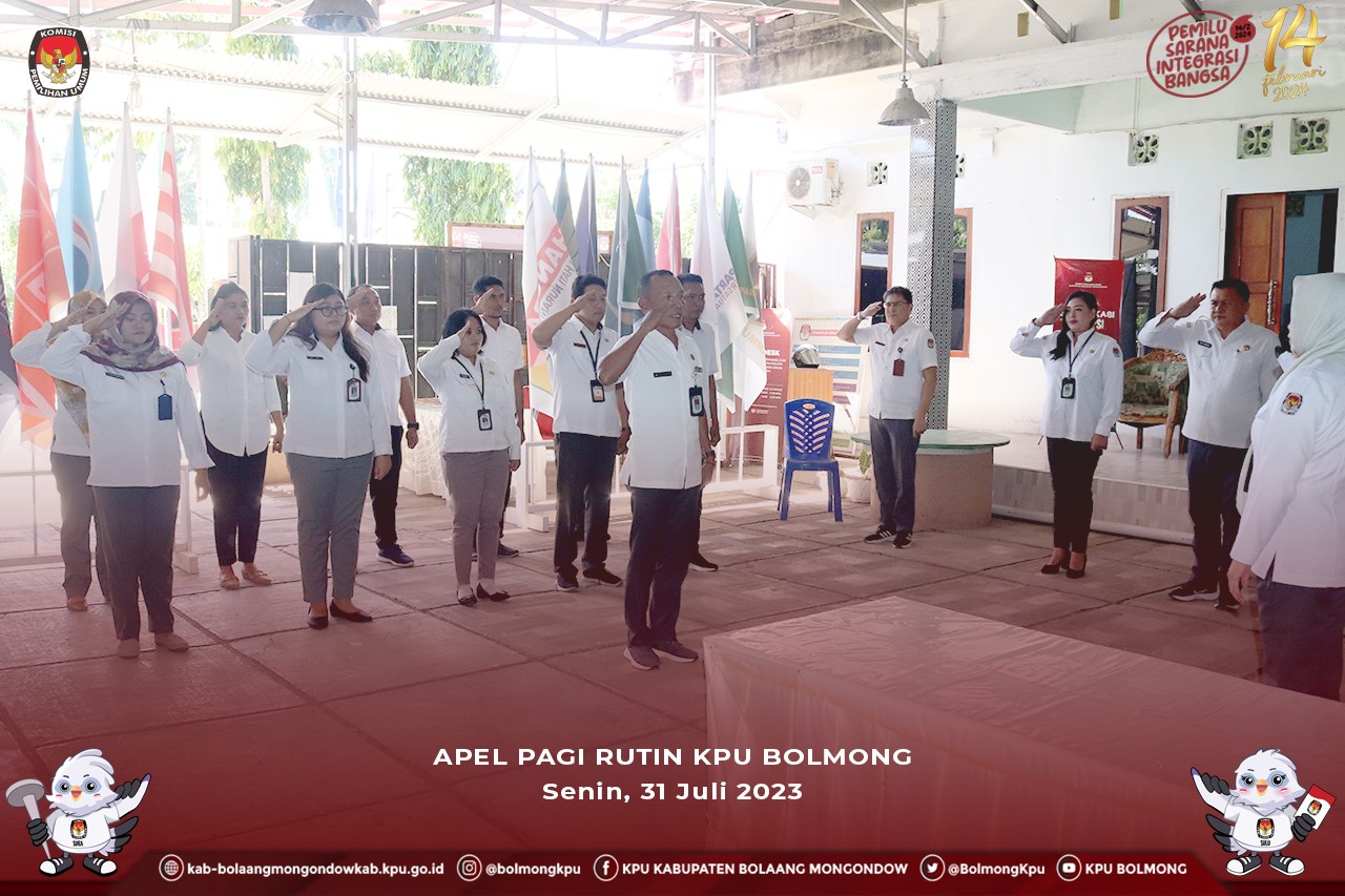 Lolak, kab.bolaangmongondow.kpu.go.id – Komisi Pemilihan Umum (KPU) Kabupaten Bolaang Mongondow (Bolmong) kembali melaksanakan Apel Pagi Rutin, Senin (31/7). Berkesempatan menjadi Pembina Apel, Ratuganesty Mokoginta.