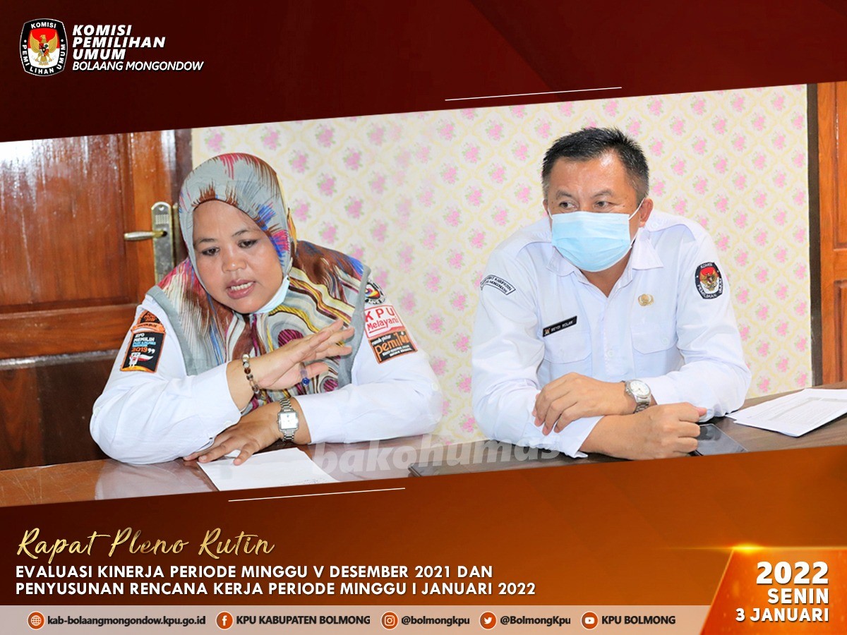 RPR dimaksud bertujuan untuk mengevaluasi pelaksanaan kegiatan selang minggu V bulan Desember Tahun 2021 serta membahas dan menetapkan rencana kerja untuk dilaksanakan pada sepanjang minggu pertama bulan Januari 2022 yang sebelumnya telah disusun oleh para Kasubag dan telah dikoordinasikan kepada masing-masing Ketua Divisi terkait. Laporan kerja dan rencana kerja yang telah dibahas dan ditetapkan dalam RPR ini menjadi dokumen resmi KPU Kabupaten Bolaang Mongondow yang selanjutnya akan disampaikan kepada KPU Provinsi Sulawesi Utara melalui Laporan SPIP (Sistem Pengendalian Intern Pemerintah) periode Januari 2021.