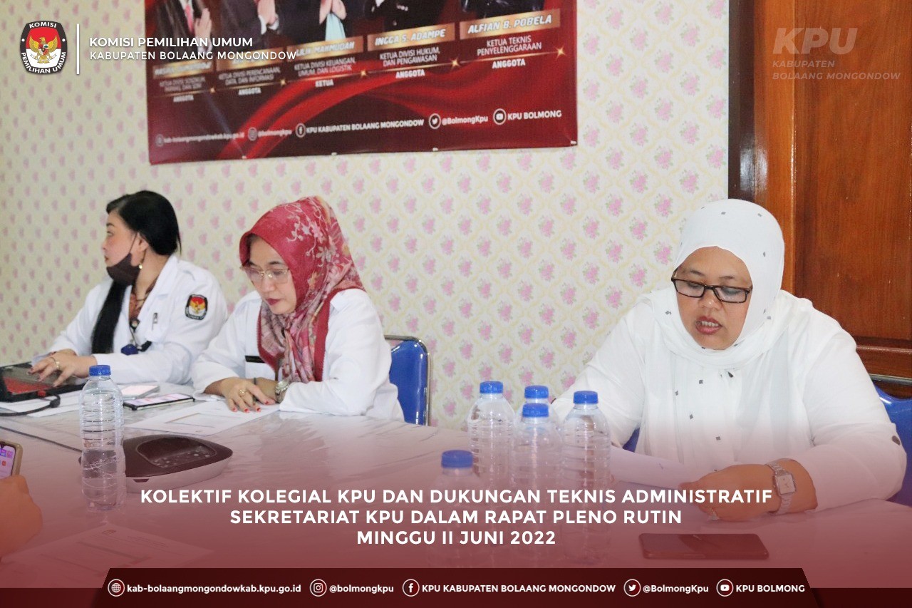 Agenda rapat pleno rutin yang dilaksanakan setiap senin setelah Apel Pagi ini merupakan wadah pengambilan kebijakan sebagaimana amanat pasal 60 ayat (1) dan ayat (2) huruf c serta pasal 63 Peraturan KPU Nomor 8 Tahun 2019 tentang Tata Kerja Komisi Pemilihan Umum, Komisi Pemilihan Umum Provinsi, dan Komisi Pemilihan Umum Kabupaten/Kota sebagaimana telah diubah dengan Peraturan Komisi Pemilihan Umum Republik Indonesia Nomor 4 Tahun 2021 Tentang Perubahan Ketiga Atas Peraturan Komisi Pemilihan Umum Nomor 8 Tahun 2019 Tentang Tata Kerja Komisi Pemilihan Umum, Komisi Pemilihan Umum Provinsi, dan Komisi Pemilihan Umum Kabupaten/Kota.