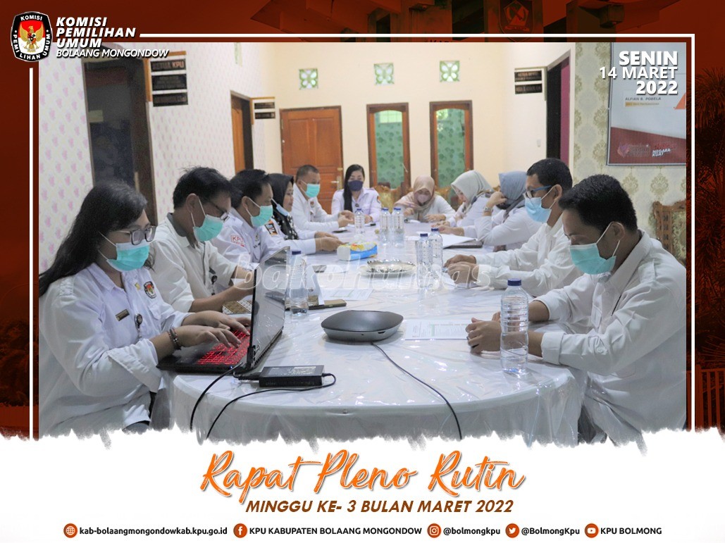 Lolak, kab-bolaangmongondow.kpu.go.id - Dalam rangka evaluasi dan pembahasan rencana kerja, KPU Kabupaten Bolaang Mongondow pada Senin (14/3) kembali menggelar Rapat Pleno Rutin.