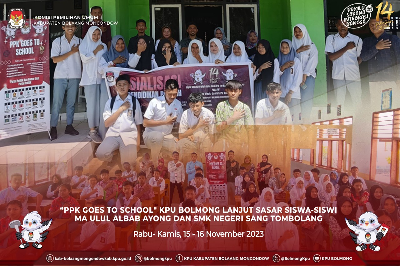 Lolak - kab-bolaangmongondow.kpu.go.id - setelah sukses menggelar program sosialisasi pendidikan pemilih (Sosdiklih) lewat program bertajuk “PPK Goes to School” di Sekolah Menengah Kejuruan (SMK) Perjuangan dan Sekolah Menengah Atas (SMA) Negeri Sang Tombolang pada bulan September dan Oktober 2023, kali ini KPU Kabupaten Bolaang Mongondow (Bolmong) melalui Panitia Pemilihan Kecamatan (PPK) kembali melaksanakan Sosdiklih dengan menyasar Siswa-Siswi di Madrasah Aliyah Ulul Albab Ayong dan SMK Negeri Sang Tombolang, Rabu-Kamis (15-16/11/2023)