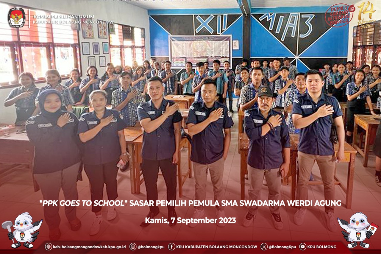 Lolak, kab.bolaangmongondow.kpu.go.id – guna peningkatan partisipasi masyarakat dalam Pemilu 2024, KPU Bolaang Mongondow (Bolmong) melalui Panitia Pemilihan Kecamatan (PPK) secara simultan menggelar sosialisasi lewat program "PPK Goes to School", dimana kali ini pelaksanaannya bertempat di Sekolah Menengah Atas (SMA) Swadarma Werdi Agung, Kecamatan Dumoga Tengah (7/9).