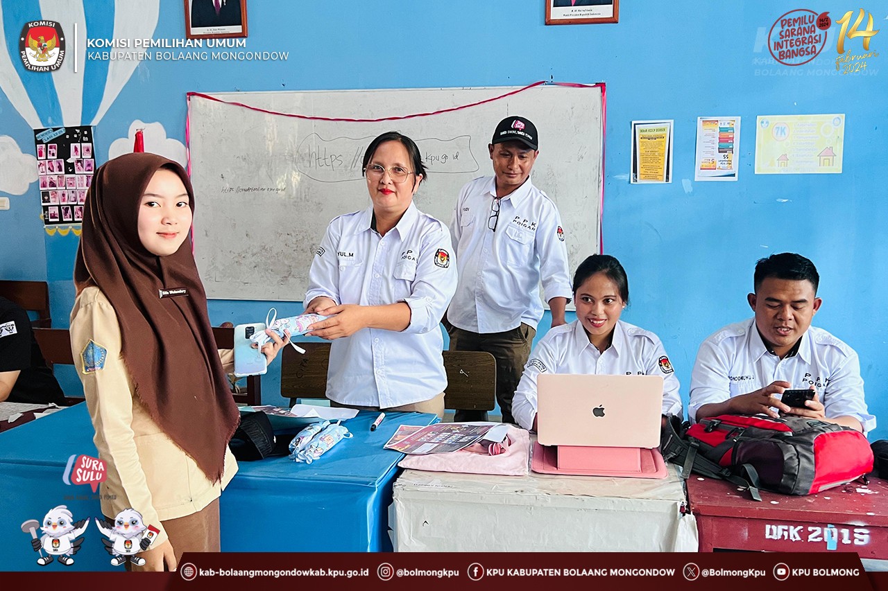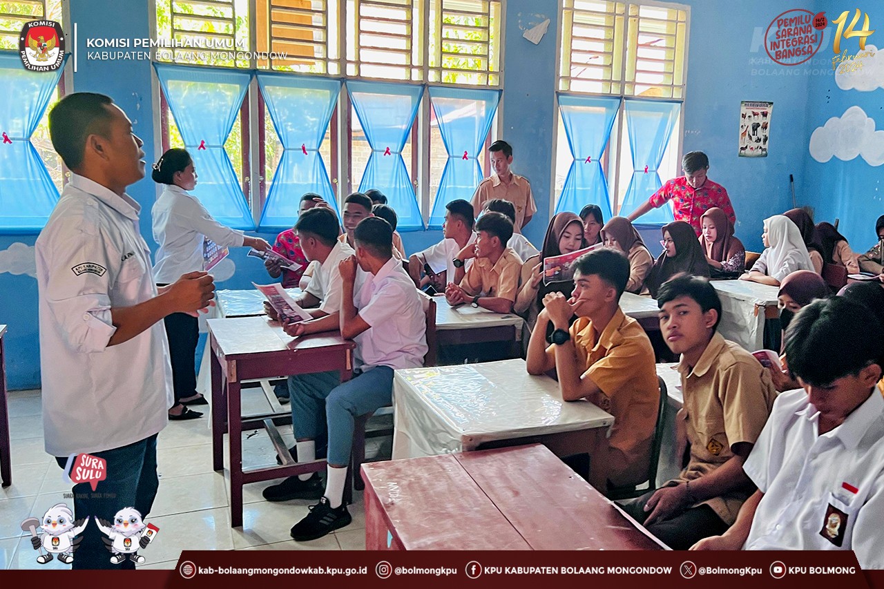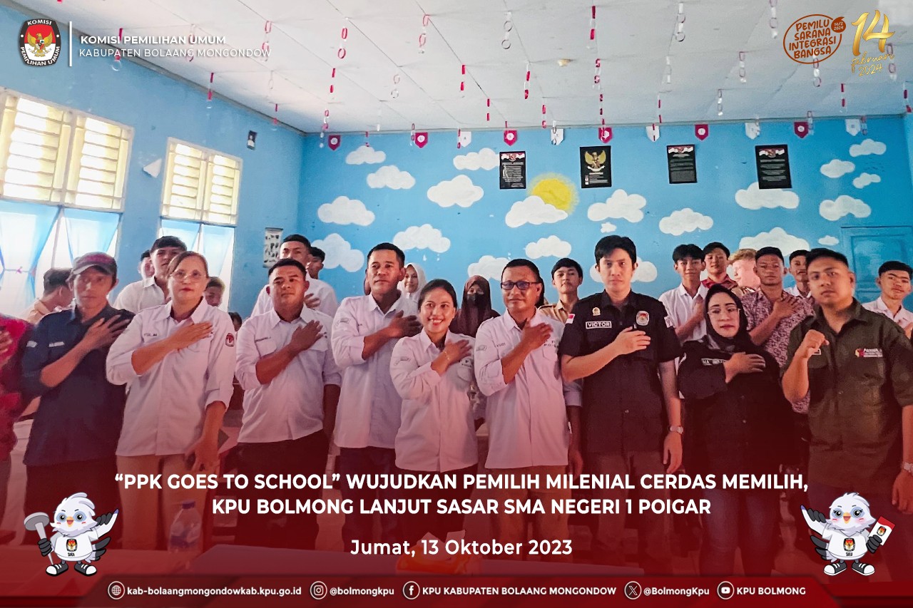 Lolak, kab-bolaangmongondow.kpu.go.id - semangat wujudkan pemilih milenial cerdas memilih, Jumat (13/10/2023) Komisi Pemilihan Umum (KPU) Kabupaten Bolaang Mongondow (Bolmong) melalui Panitia Pemilihan Kecamatan (PPK) Poigar kembali gelar sosialisasi pendidikan pemilih lewat program bertajuk “PPK Goes to School” dimana kali ini bertempat di Sekolah Menengah Atas (SMA) Negeri 1 Poigar.