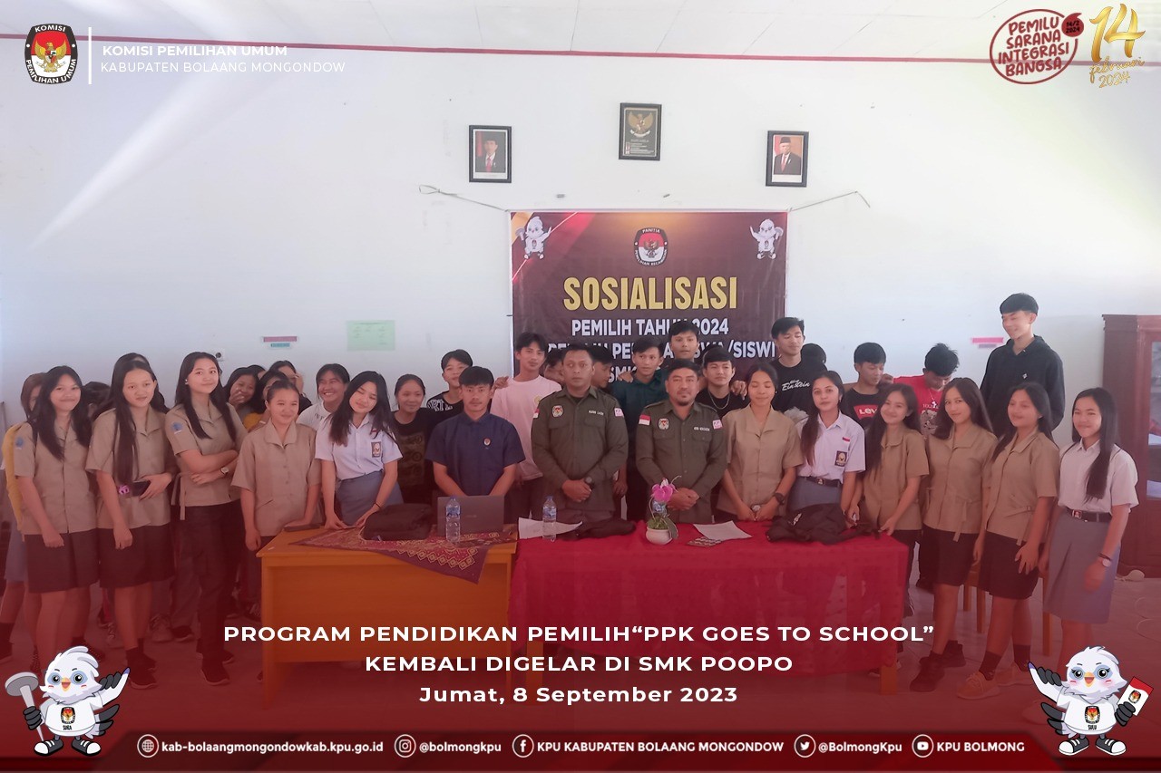 Memerhatikan Peraturan KPU Nomor 3 Tahun 2022 tentang Tahapan dan Jadwal Penyelengaraan Pemilihan Umum Tahun 2024, dan Peraturan KPU Nomor 9 Tahun 2022 tentang Partisipasi Masyarakat Dalam Pemilihan Umum dan Pemilihan Gubernur dan Wakil Gubernur, Bupati dan Wakil Bupati, dan/atau Walikota dan Wakil Walikota, KPU Bolmong melalui PPK Passi Timur menyasar peserta didik calon pemilih pemula pada Pemilu tahun 2024 di SMK POOPO.