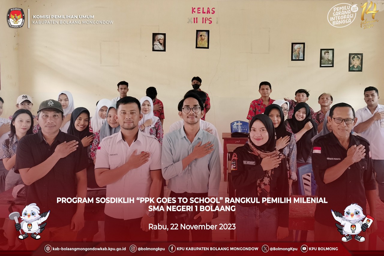 Kegiatan ini digelar oleh PPK Bolaang dengan peserta kategori pemilih Milenial dari Siswa-Siswi SMA Negeri 1 Bolaang sebagai upaya mengedukasi pemilih terkait kepemiluan serta peran penting mereka dalam Pemilu tahun 2024.