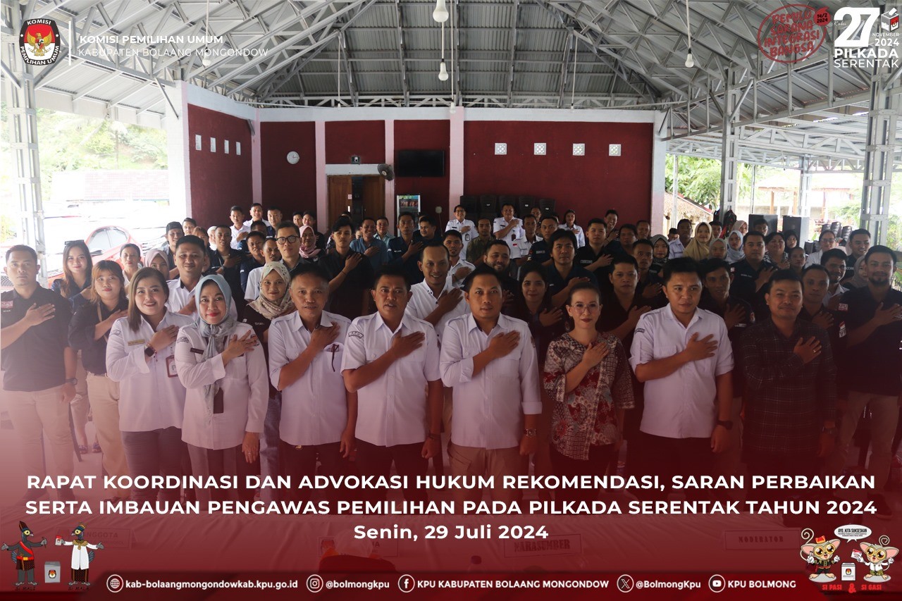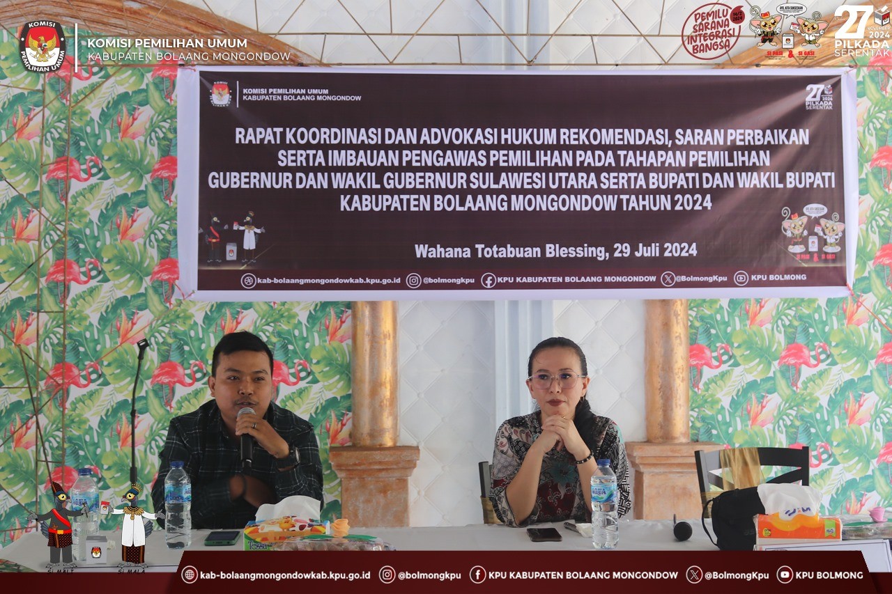 Lolak, kab-bolaangmongondow.kpu.go.id - Ketua KPU Kabupaten Bolaang Mongondow (Bolmong), Afif Zuhri membuka Rapat Koordinasi dan Advokasi Hukum Rekomendasi, Saran Perbaikan serta Imbauan Pengawas Pemilihan pada Tahapan Pemilihan Gubernur dan Wakil Gubernur Sulawesi Utara serta Bupati dan Wakil Kabupaten Bolaang Mongondow Tahun 2024, Senin (29/7/2024).