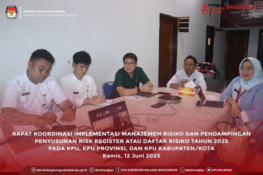 Lolak, kab-bolaangmongondow.kpu.go.id - Kamis (12/6/2025), KPU Kabupaten Bolaang Mongondow (Bolmong) mengikuti kegiatan Rapat Koordinasi (Rakor) Implementasi Manajemen Risiko dan Pendampingan Penyusunan Risk Register atau Daftar Risiko Tahun 2025.