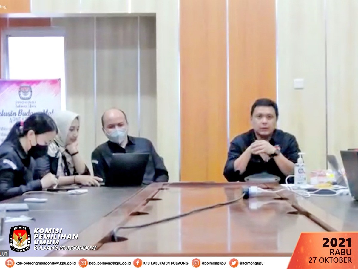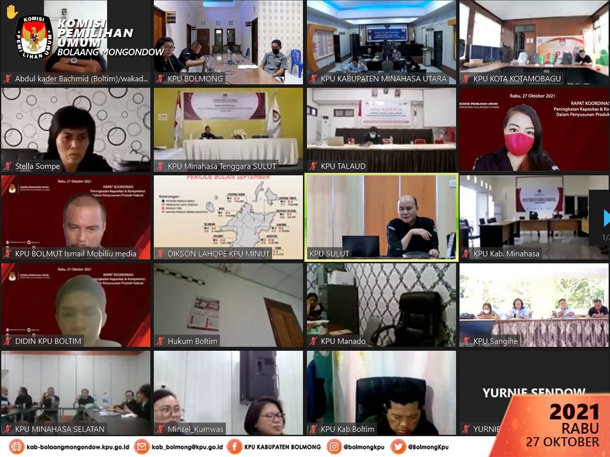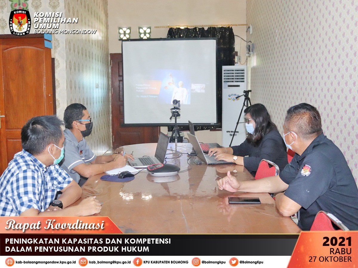 Lolak - Pada hari Rabu (27/10), KPU Kabupaten Bolaang Mongondow mengikuti Rapat Koordinasi Peningkatan Kapasitas dan Kompetensi dalam Penyusunan Produk Hukum yang diselenggarakan oleh KPU Provinsi Sulawesi Utara sesuai dengan Surat Undangan Nomor 395/HK.03/71/2021 yang mengundang Ketua KPU, Anggota KPU (Ketua Divisi Hukum dan Pengawasan serta Wakil Ketua Divisi Hukum dan Pengawasan), Sekretaris, Kepala Subbagian Hukum dan Staf Pelaksana Subbagian Hukum Se-Sulawesi Utara. Dari KPU Kabupaten Bolaang Mongondow diikuti oleh Anggota KPU (Ketua Divisi Hukum dan Pengawasan) Ingga S. Adampe, Anggota KPU (Wakil Ketua Divisi Hukum dan Pengawasan) Afif Zuhri, Sekretaris KPU Meydi Wolah, Kepala Subbagian Hukum Evie Jane Indria, dan Staf Pelaksana Ni Made Desika Putri.
