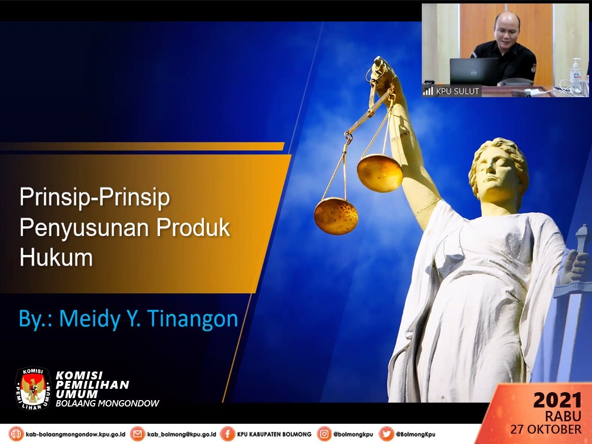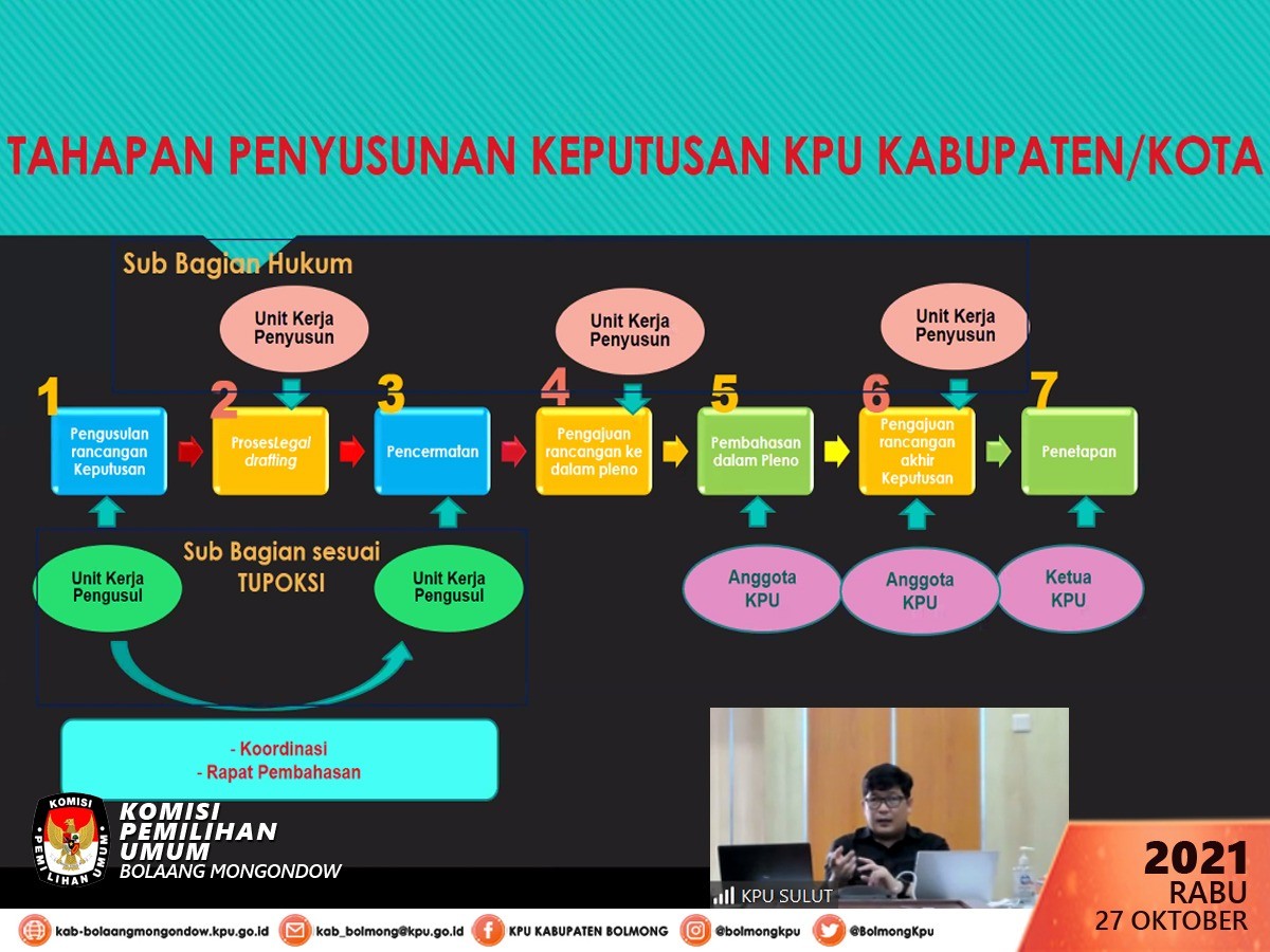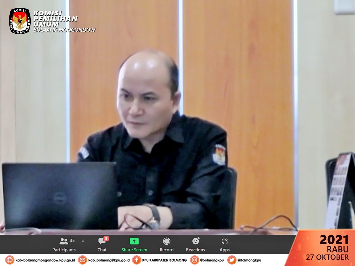 Lolak - Pada hari Rabu (27/10), KPU Kabupaten Bolaang Mongondow mengikuti Rapat Koordinasi Peningkatan Kapasitas dan Kompetensi dalam Penyusunan Produk Hukum yang diselenggarakan oleh KPU Provinsi Sulawesi Utara sesuai dengan Surat Undangan Nomor 395/HK.03/71/2021 yang mengundang Ketua KPU, Anggota KPU (Ketua Divisi Hukum dan Pengawasan serta Wakil Ketua Divisi Hukum dan Pengawasan), Sekretaris, Kepala Subbagian Hukum dan Staf Pelaksana Subbagian Hukum Se-Sulawesi Utara. Dari KPU Kabupaten Bolaang Mongondow diikuti oleh Anggota KPU (Ketua Divisi Hukum dan Pengawasan) Ingga S. Adampe, Anggota KPU (Wakil Ketua Divisi Hukum dan Pengawasan) Afif Zuhri, Sekretaris KPU Meydi Wolah, Kepala Subbagian Hukum Evie Jane Indria, dan Staf Pelaksana Ni Made Desika Putri.