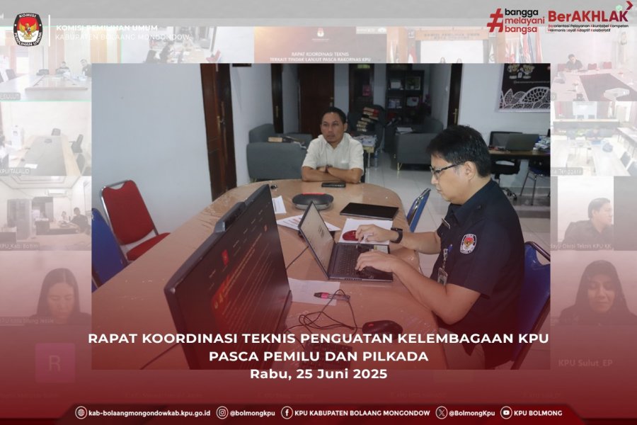 Lolak, kab-bolaangmongondow.kpu.go.id, Rabu (25/6/2025) dalam rangka penguatan kelembagaan KPU pasca pelaksanaan tahapan Pemilu dan Pilkada, KPU Provinsi Sulawesi Utara (Sulut) melaksanakan rapat koordinasi teknis secara daring bersama 15 KPU Kabupaten/Kota se- Sulut pada Rabu (25/6/2025).