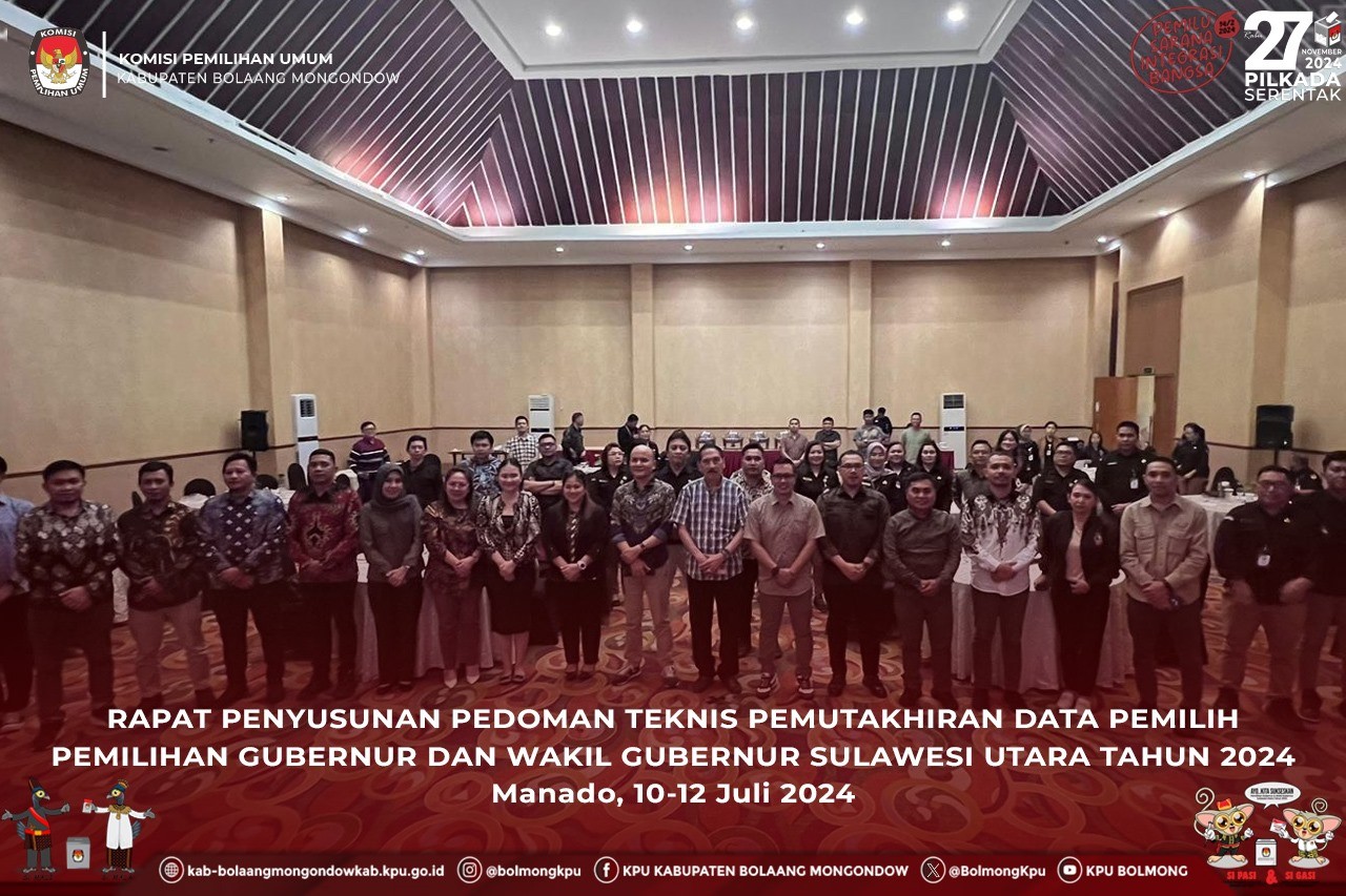 Lolak, kab-bolaangmongondow.kpu.go.id - Komisi Pemilihan Umum (KPU) Provinsi Sulawesi Utara (Sulut) menggelar Rapat Penyusunan Pedoman Teknis Pemutakhiran Data Pemilih Pemilihan Gubernur dan Wakil Gubernur Sulawesi Utara Tahun 2024 bersama 15 KPU Kabupaten/Kota se- Sulut sejak tanggal 10 s.d. 14 Juli 2024.