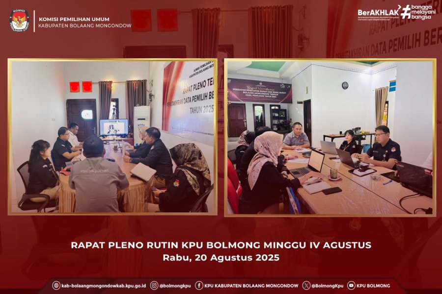 Rapat pleno rutin yang merupakan sarana pengambilan kebijakan tertinggi di lingkungan KPU Kabupaten Bolaang Mongondow ini dihadiri baik jajaran KPU maupun Sekretariat, mulai dari Ketua dan Anggota, Sekretaris, serta masing-masing Kepala Sub Bagian KPU Bolmong. Adapun agenda-agenda yang dibahas dalam rapat ini yakni terkait Pemutakhiran Data Pemilih Berkelanjutan Triwulan III Tahun 2025, persiapan pelaksanaan Kajian Teknis Pemilu dan Pemilihan, penyusunan dan pemutakhiran Daftar Informasi Publik, serta agenda-agenda lainnya dari masing-masing divisi dan sub bagian sebagaimana rencana kerja yang telah disusun.
