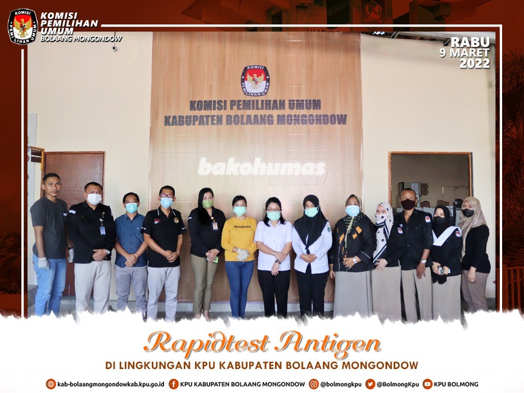 Lolak, kab-bolaangmongondow.kpu.go.id - Langkah pencegahan terus dilakukan demi memutus mata rantai penyebaran Covid-19 di lingkungan Komisi Pemilihan Umum Kabupaten Bolaang Mongondow dengan dilaksanakannya Rapid Tes Antigen bagi Komisioner dan jajaran Sekretariat oleh tim dari Dinas Kesehatan Kabupaten Bolaang Mongondow pada Rabu (9/3).