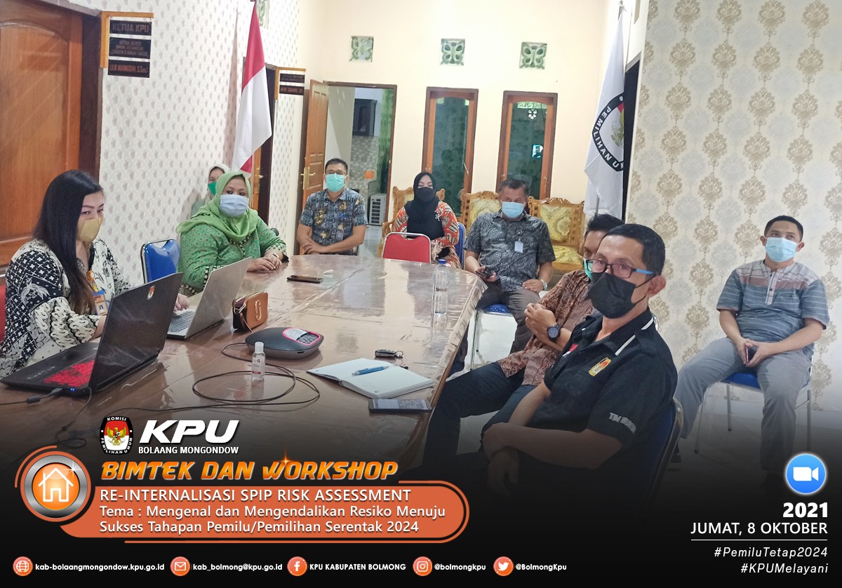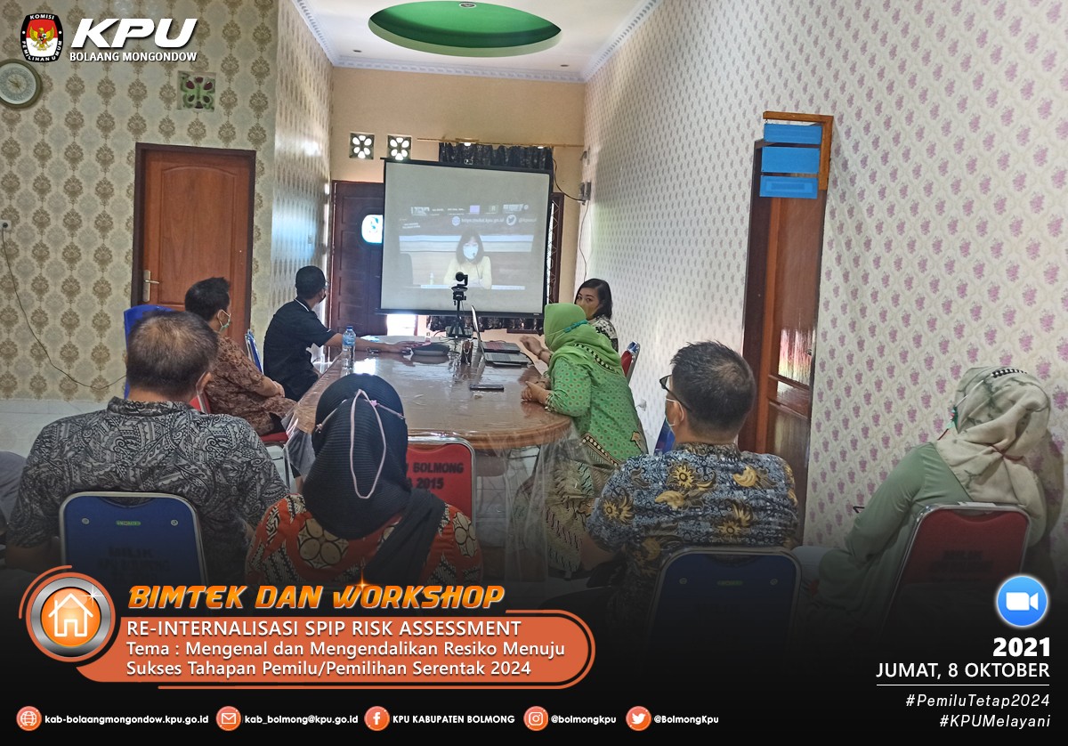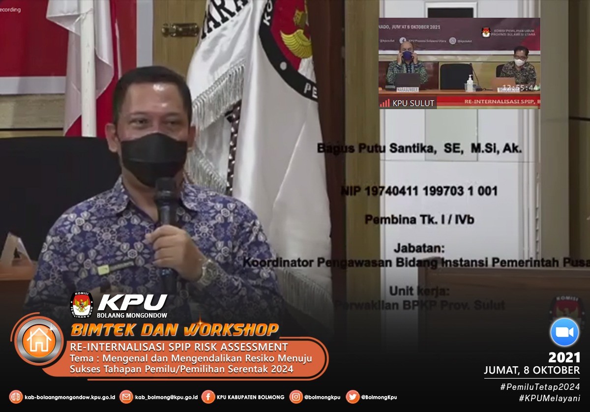 Sesuai dengan Undangan Komisi Pemilihan Umum Provinsi Sulawesi Utara Nomor 378/PW.01/71/2021 pada hari Jumat (8/10) Komisi Pemilihan Umum Kabupaten Bolaang Mongondow mengikuti acara Reinternalisasi SPIP, Bimtek dan Workshop Risk Assesment tersebut, adapun narasumber dalam acara ini adalah Meidy Y. Tinangon (Anggota KPU Provinsi Sulawesi Utara Divisi Hukum dan Pengawasan), Pujiastuti (Sekretaris KPU Provinsi Sulawesi Utara) dan Bagus Putu Santika (Koordinator Pengawasan Bidang Instansi Pemerintah Pusat BPKP Sulawesi Utara).
