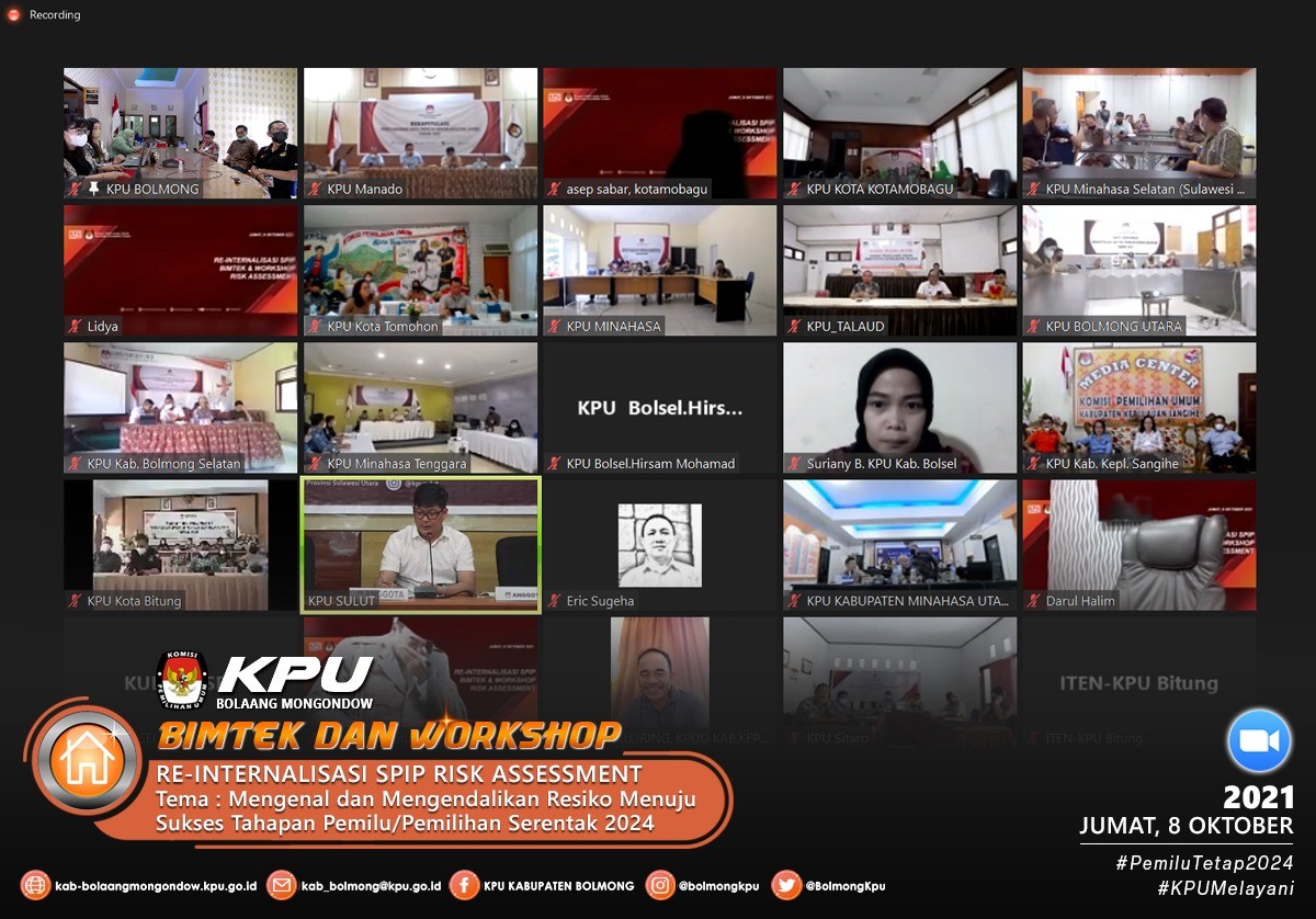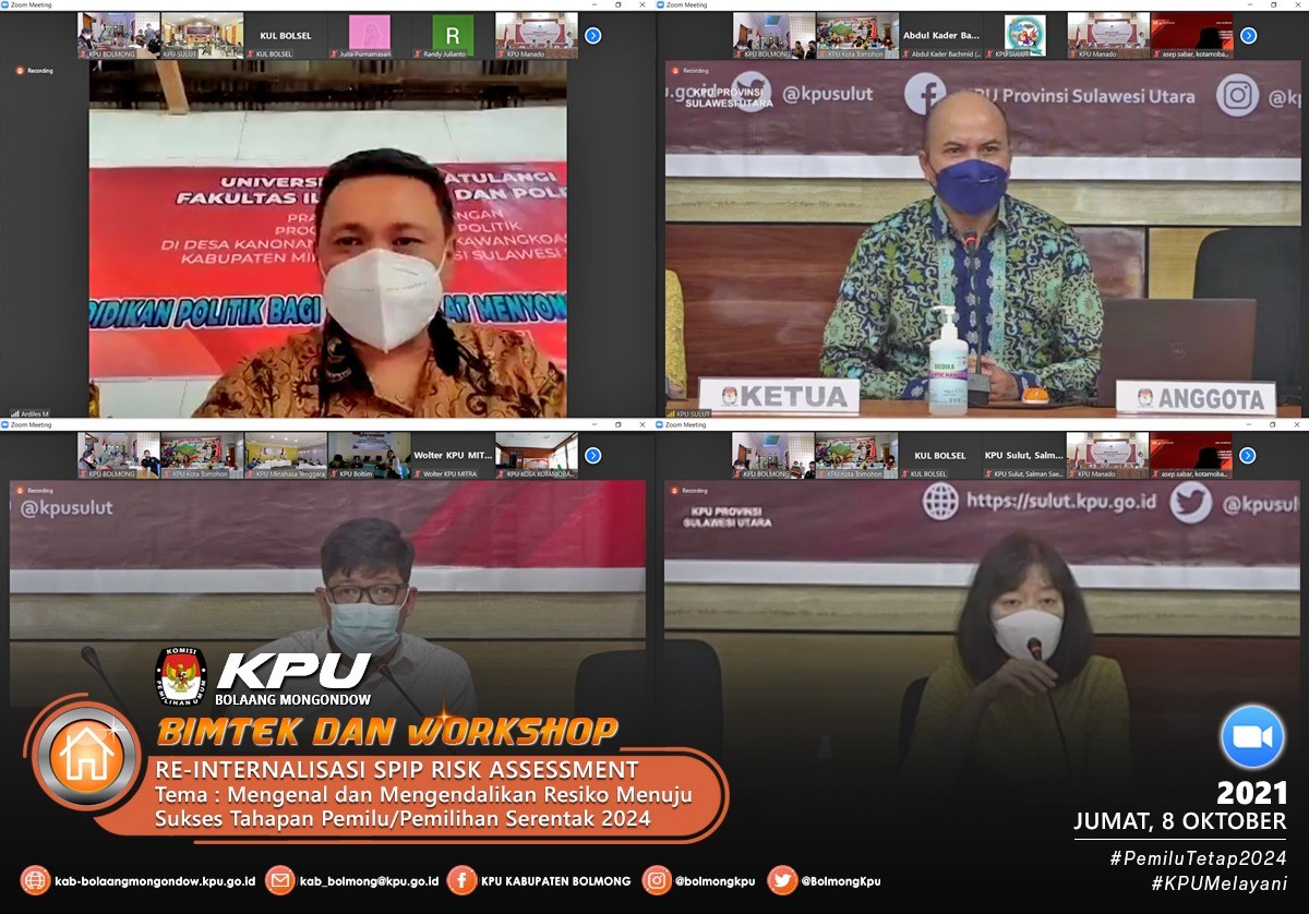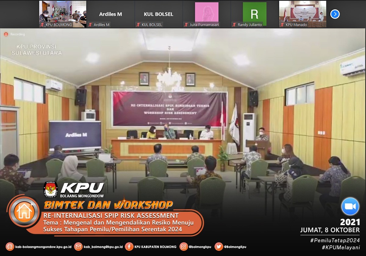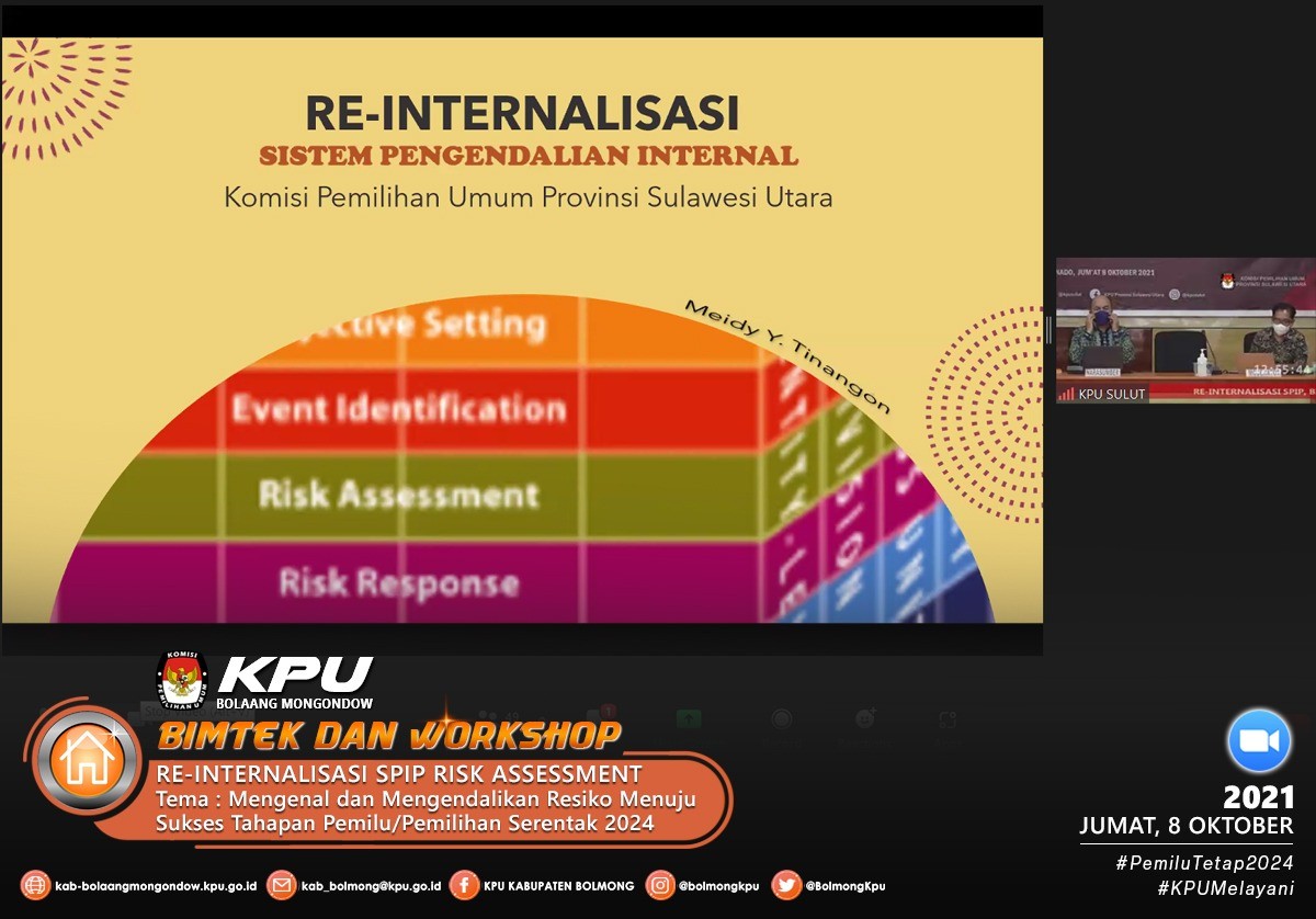 Sesuai dengan Undangan Komisi Pemilihan Umum Provinsi Sulawesi Utara Nomor 378/PW.01/71/2021 pada hari Jumat (8/10) Komisi Pemilihan Umum Kabupaten Bolaang Mongondow mengikuti acara Reinternalisasi SPIP, Bimtek dan Workshop Risk Assesment tersebut, adapun narasumber dalam acara ini adalah Meidy Y. Tinangon (Anggota KPU Provinsi Sulawesi Utara Divisi Hukum dan Pengawasan), Pujiastuti (Sekretaris KPU Provinsi Sulawesi Utara) dan Bagus Putu Santika (Koordinator Pengawasan Bidang Instansi Pemerintah Pusat BPKP Sulawesi Utara).