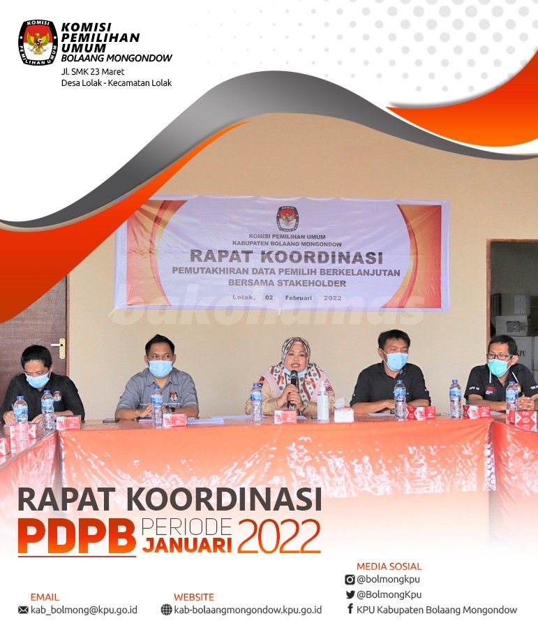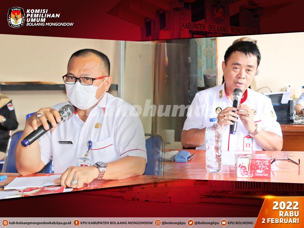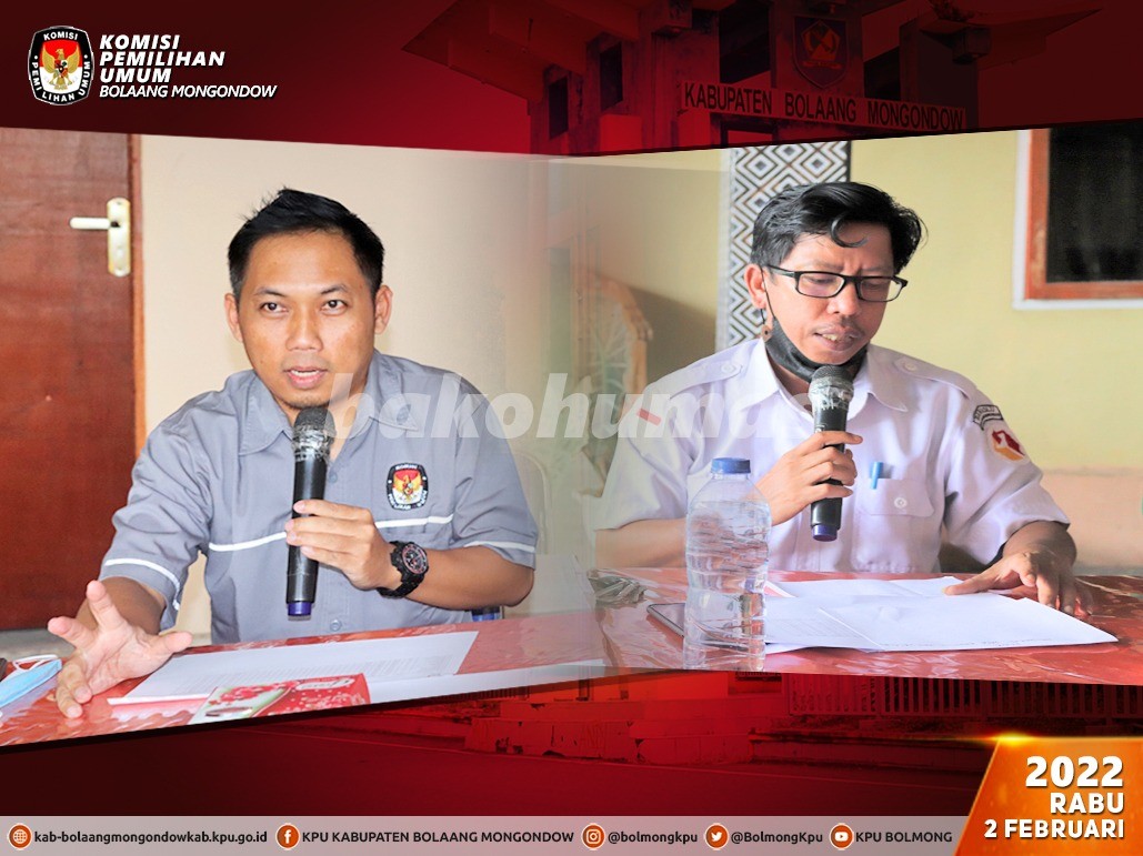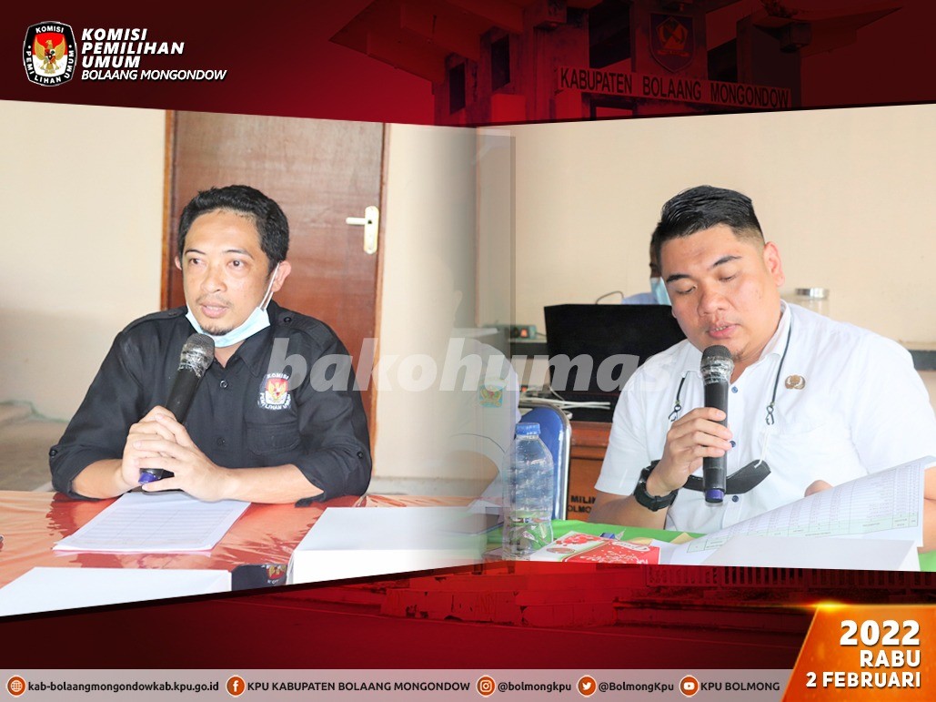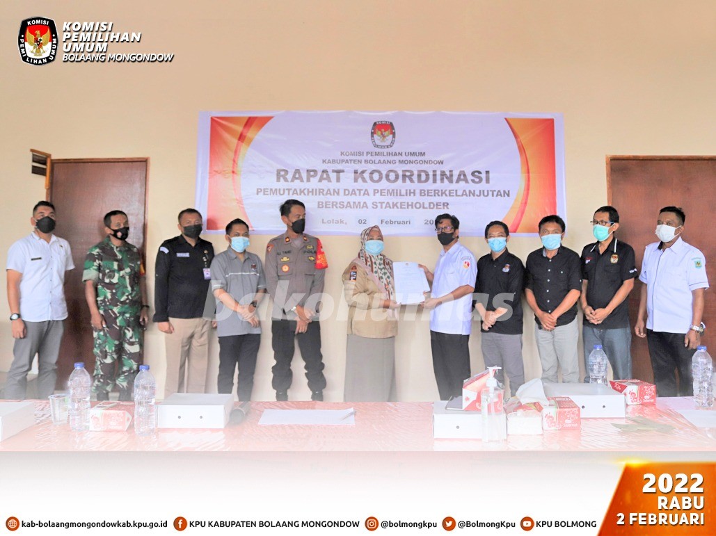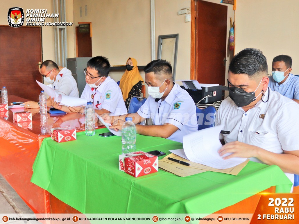 Lolak, Bolmong - Berdasarkan Peraturan Komisi Pemilihan Umum Republik Indonesia Nomor 6 Tahun 2021 perihal Pemutakhiran Data Pemilih Berkelanjutan, maka Komisi Pemilihan Umum Kabupaten Bolaang Mongondow pada Rabu, 2 Februari pukul 10.00 Wita telah melaksanakan Rekapitulasi Pemutakhiran Data Pemilih Berkelanjutan Tahun 2022 Periode bulan Januari 2022 bertempat di Kantor KPU Kabupaten Bolaang Mongondow dengan penerapan protokol kesehatan pencegahan dan pengendalian Covid-19. Kegiatan yang merupakan agenda rutin ini turut dihadiri oleh Asisten Pemerintahan dan Kesra Kab. Bolaang Mongondow, Kabag Ops Polres Bolaang Mongondow, Kodim 1303 Bolaang Mongondow, Kepala Badan Kesbangpol Kab. Bolaang Mongondow, Dinas Kependudukan dan Catatan Sipil Kab. Bolaang Mongondow, Camat Bolaang serta Bawaslu Kab. Bolaang Mongondow