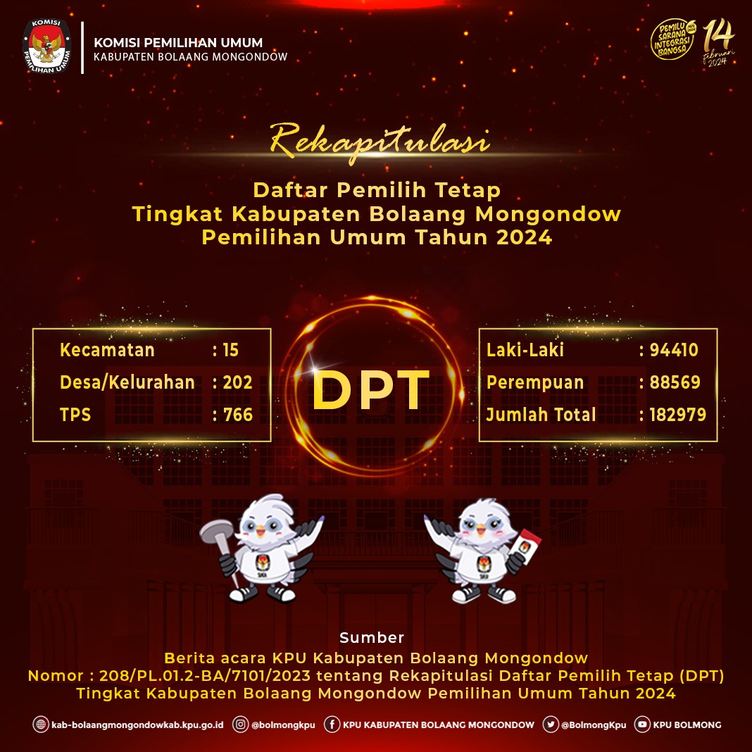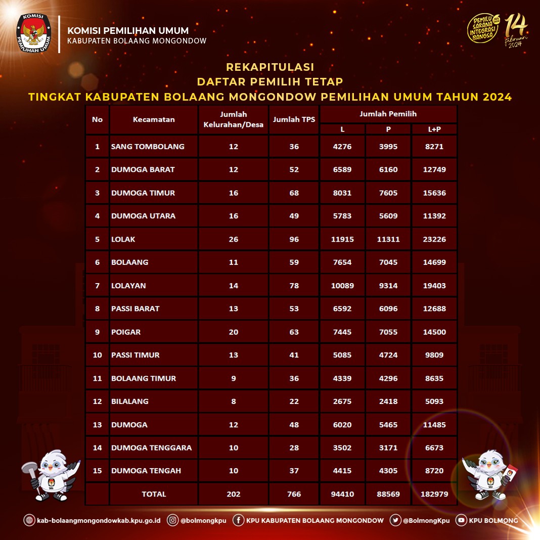 REKAPITULASI DAFTAR PEMILIH TETAP (DPT) KABUPATEN BOLAANG MONGONDOW UNTUK PEMILIHAN UMUM TAHUN 2024