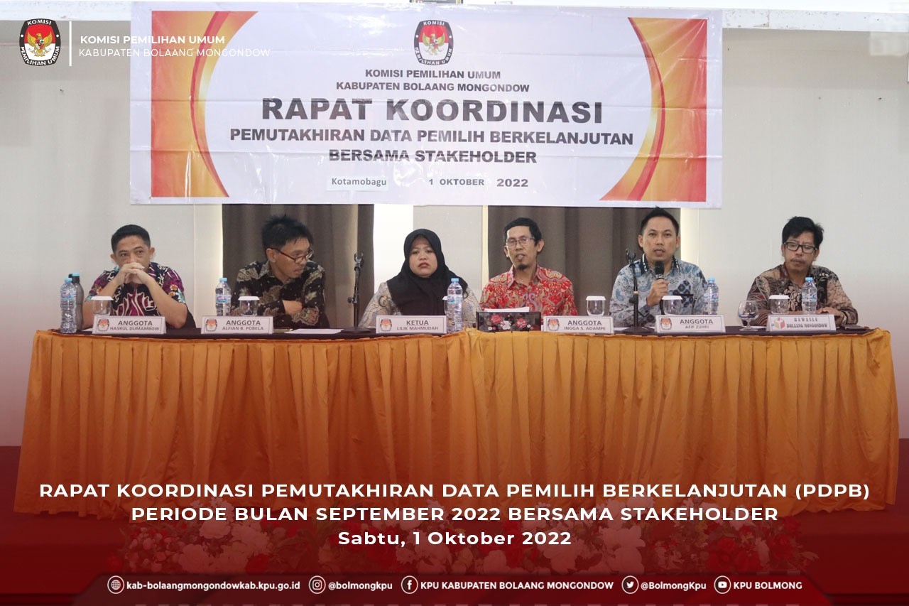 Lolak, kab-bolaangmongondow.kpu.go.id - Komisi Pemilihan Umum Kabupaten Bolaang Mongondow kembali melaksanakan Rapat Koordinasi Pemutakhiran Data Pemilih Berkelanjutan Bersama Stakeholder Tahun 2022 Periode September 2022 pada Sabtu (01/10). Rapat Koordinasi ini dilaksanakan di Hotel Sutanraja, Kotamobagu. Adapun peserta yang hadir dalam kegiatan ini adalah Ketua dan Anggota KPU Kabupaten Bolaang Mongondow, Ketua Bawaslu Kabupaten Bolaang Mongondow, Assisten 1 Pemerintah Kabupaten Bolaang Mongondow, Kepala Dinas Kependudukan dan Pencatatan Sipil Kab. Bolaang Mongondow, Badan Kesatuan Bangsa dan Politik Kab. Bolaang Mongondow, Dinas Pemberdayaan Masyarakat dan Desa, Kantor Kementerian Agama Kabupaten Bolaang Mongondow, Cabang Dinas Pendidikan Provinsi Sulawesi Utara UPTD Bolaang Mongondow, Kodim 1303 Bolaang Mongondow, Polres Bolaang Mongondow, Polres Kota Kotamobagu, Camat Bilalang, Camat Passi Timur, Camat Passi Barat, Camat Dumoga, Camat Dumoga Tengah, Camat Dumoga Timur, Camat Dumoga Utara, Camat Dumoga Tenggara, Kasubbag Perencanaan, Data dan Informasi, dan Staf Sekretariat KPU Kab. Bolaang Mongondow.
