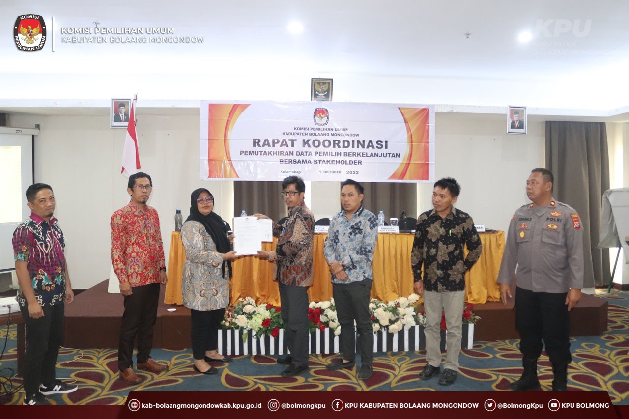 Selanjutnya penyampaian materi dari Pangkerego (Ketua Bawaslu Kab. Bolaang Mongondow) terkait Pemutakhiran Data Pemilih Berkelanjutan dan Problematikanya, setelah itu dilanjutkan penyampaian dari Alfian Pobela selaku Ketua Divisi Teknis Penyelenggaraan Pemilu Kab. Bolaang Mongondow, selanjutnya penandatanganan Berita Acara Nomor : 94/TIK.04-BA/7101/2022 tentang Rapat Koordinasi Pemutakhiran Data Pemilih Berkelanjutan Bersama Stakeholder Tahun 2022 Periode September 2022 oleh Ketua dan Anggota KPU Kabupaten Bolaang Mongondow, serta serah terima Berita Acara tersebut kepada Ketua Bawaslu Kabupaten Bolaang Mongondow, Kepala Dinas Kependudukan dan Pencatatan Sipil Kab. Bolaang Mongondow, Kodim 1303 Bolaang Mongondow, Polres Bolaang Mongondow, dan Polres Kota Kotamobagu.