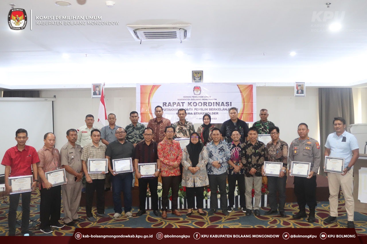 Kegiatan ini diakhiri dengan penyerahan Piagam Penghargaan dari KPU Kab. Bolaang Mongondow kepada Stakeholder sebagai tanda terimakasih terhadap dukungan kepada KPU Kab Bolaang Mongondow dalam melaksanakan Pemutakhiran Data Pemilih Berkelanjutan selama ini.