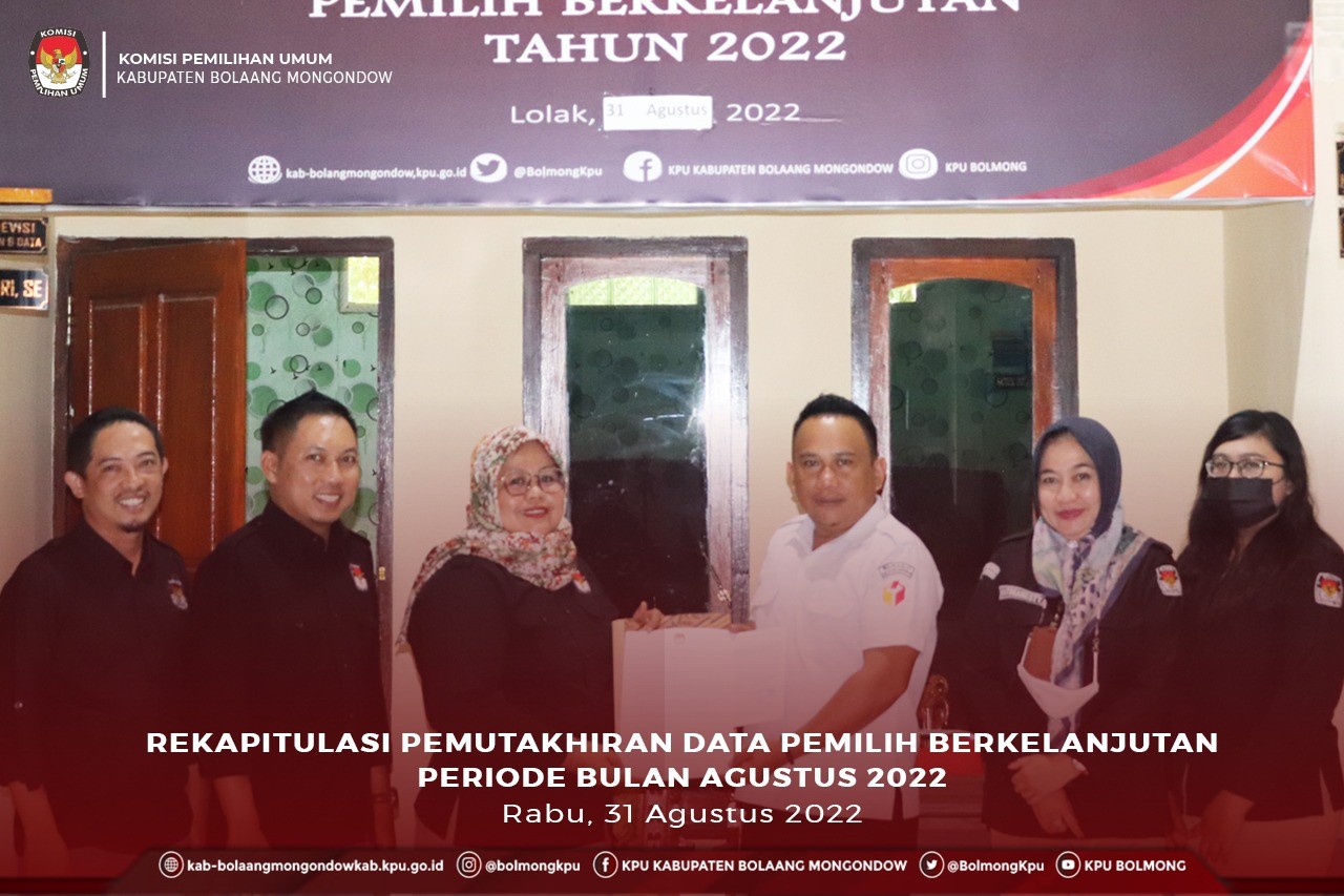 Kegiatan ini dibuka oleh Ketua KPU Kabupaten Bolaang Mongondow Lilik Mahmudah, kemudian secara teknis kegiatan ini dipimpin oleh Afif Zuhri selaku Ketua Divisi Perencanaan, Data dan Informasi KPU Kabupaten Bolaang Mongondow yang menyampaikan bahwa Rekapitulasi Pemilih Berkelanjutan Periode Agustus 2022 berjumlah 165.253 (Seratus enam puluh lima ribu dua ratus lima puluh tiga), dengan rincian Pemilih laki-laki berjumlah 85.273 (delapan puluh lima ribu dua ratus tujuh puluh tiga) dan Pemilih perempuan berjumlah 79.980 (Tujuh puluh sembilan ribu sembilan ratus selapan puluh), pada bulan ini tertambah potensi Pemilih Baru berjumlah 190 (Seratus sembilan puluh) dan Jumlah Pemilih Tidak Memenuhi Syarat sebanyak 873 (Delapan ratus tujuh puluh tiga). Pemilih tersebut tersebar pada 15 (lima belas) Kecamatan di wilayah Kabupaten Bolaang Mongondow.