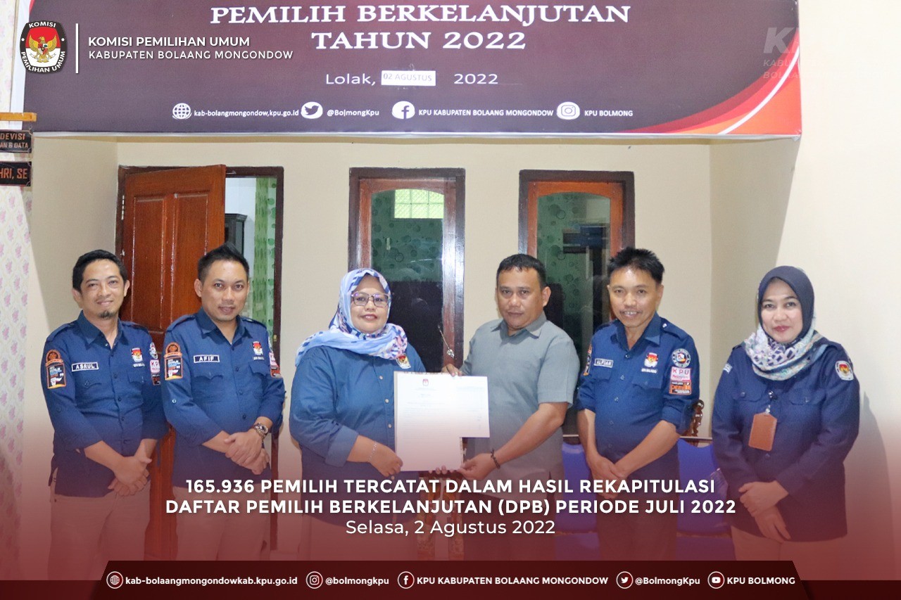 Kegiatan ini dibuka oleh Ketua KPU Kabupaten Bolaang Mongondow Ibu Lilik Mahmudah, kemudian secara teknis kegiatan ini dipimpin oleh Bapak Afif Zuhri selaku Ketua Divisi Perencanaan, Data dan Informasi KPU Kabupaten Bolaang Mongondow yang menyampaikan bahwa Rekapitulasi Pemilih Berkelanjutan Periode Juli 2022 berjumlah 165.936 (Seratus enam puluh lima ribu sembilan ratus tiga puluh enam), dengan rincian Pemilih laki-laki berjumlah 85.637 (delapan puluh lima ribu enam ratus tiga puluh tujuh) dan Pemilih perempuan berjumlah 80.299 (delapan puluh ribu dua ratus sembilan puluh sembilan), pada bulan ini tertambah potensi Pemilih Baru berjumlah 1.076 (Seribu tujuh puluh enam) dan Jumlah Pemilih Tidak Memenuhi Syarat sebanyak 958 (Sembilan ratus lima puluh delapan). Pemilih tersebut tersebar pada 15 (lima belas) Kecamatan di wilayah Kabupaten Bolaang Mongondow.