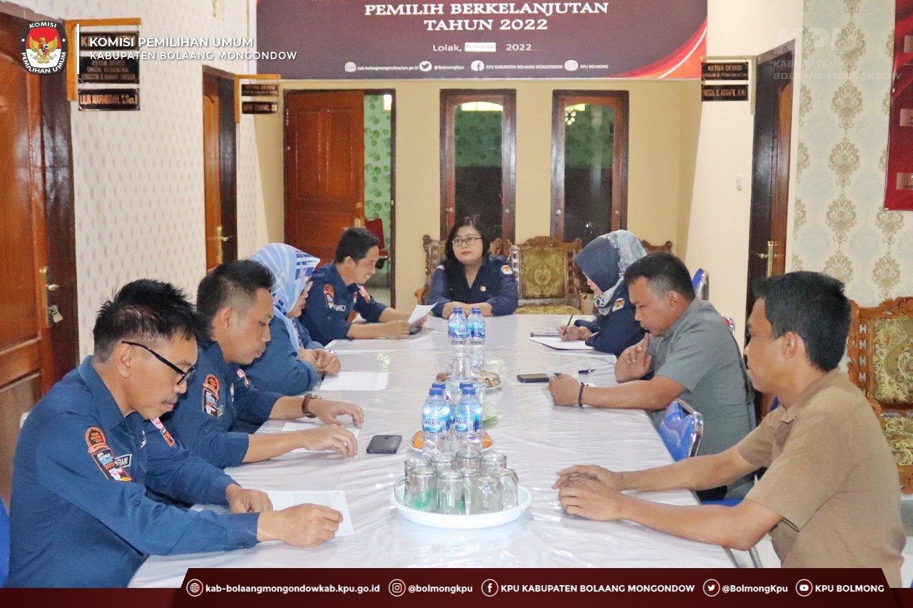 Lolak, kab-bolaangmongondow.kpu.go.id - Guna memelihara, memperbaharui, dan mengevaluasi DPT Pemilu atau Pemilihan terakhir secara terus-menerus dan berkelanjutan yang digunakan untuk penyusunan DPT pada Pemilu dan/atau Pemilihan berikutnya, berdasarkan Peraturan Komisi Pemilihan Umum Republik Indonesia Nomor 6 Tahun 2021 perihal Pemutakhiran Data Pemilih Berkelanjutan Tahun 2021, maka Komisi Pemilihan Umum Kabupaten Bolaang Mongondow kembali menggelar Rekapitulasi Pemutakhiran Data Pemilih Berkelanjutan Tahun 2022 Periode bulan Juli Tahun 2022 pada Selasa (02/08). Adapun peserta yang hadir dalam kegiatan ini adalah Ketua dan Anggota KPU Kabupaten Bolaang Mongondow, Kasubbag Perencanaan, Data dan Informasi, Staf Sekretariat, turut hadir juga Staf Bawaslu Kabupaten Bolaang Mongondow.