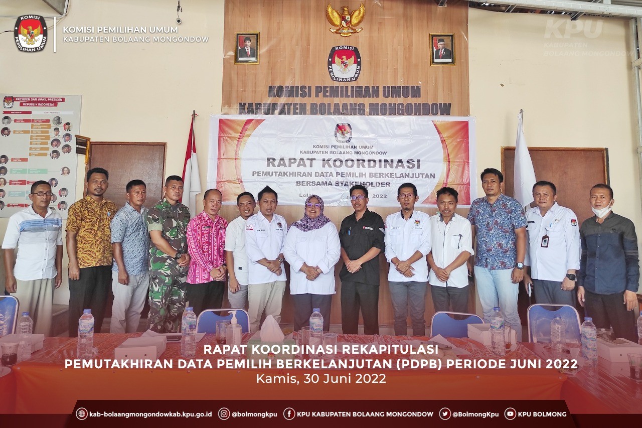 Kegiatan ini dibuka oleh Ketua KPU Kabupaten Bolaang Mongondow Ibu Lilik Mahmudah, kemudian secara teknis kegiatan ini dipimpin oleh Bapak Afif Zuhri selaku Ketua Divisi Perencanaan, Data dan Informasi KPU Kabupaten Bolaang Mongondow yang menyampaikan bahwa Rekapitulasi Pemilih Berkelanjutan Periode Juni 2022 berjumlah 165.818 (Seratus enam puluh lima ribu delapan ratus delapan belas), dengan rincian Pemilih laki-laki berjumlah 85.689 (Delapan puluh lima ribu enam ratus delapan puluh sembilan) dan Pemilih perempuan berjumlah 80.129 (Delapan puluh ribu seratus dua puluh sembilan), pada bulan ini tertambah potensi Pemilih Baru berjumlah 2.705 (Dua ribu tujuh ratus lima) dan Jumlah Pemilih Tidak Memenuhi Syarat sebanyak 3.031 (Tiga ribu tiga puluh satu). Pemilih tersebut tersebar pada 15 (lima belas) Kecamatan di wilayah Kabupaten Bolaang Mongondow.
