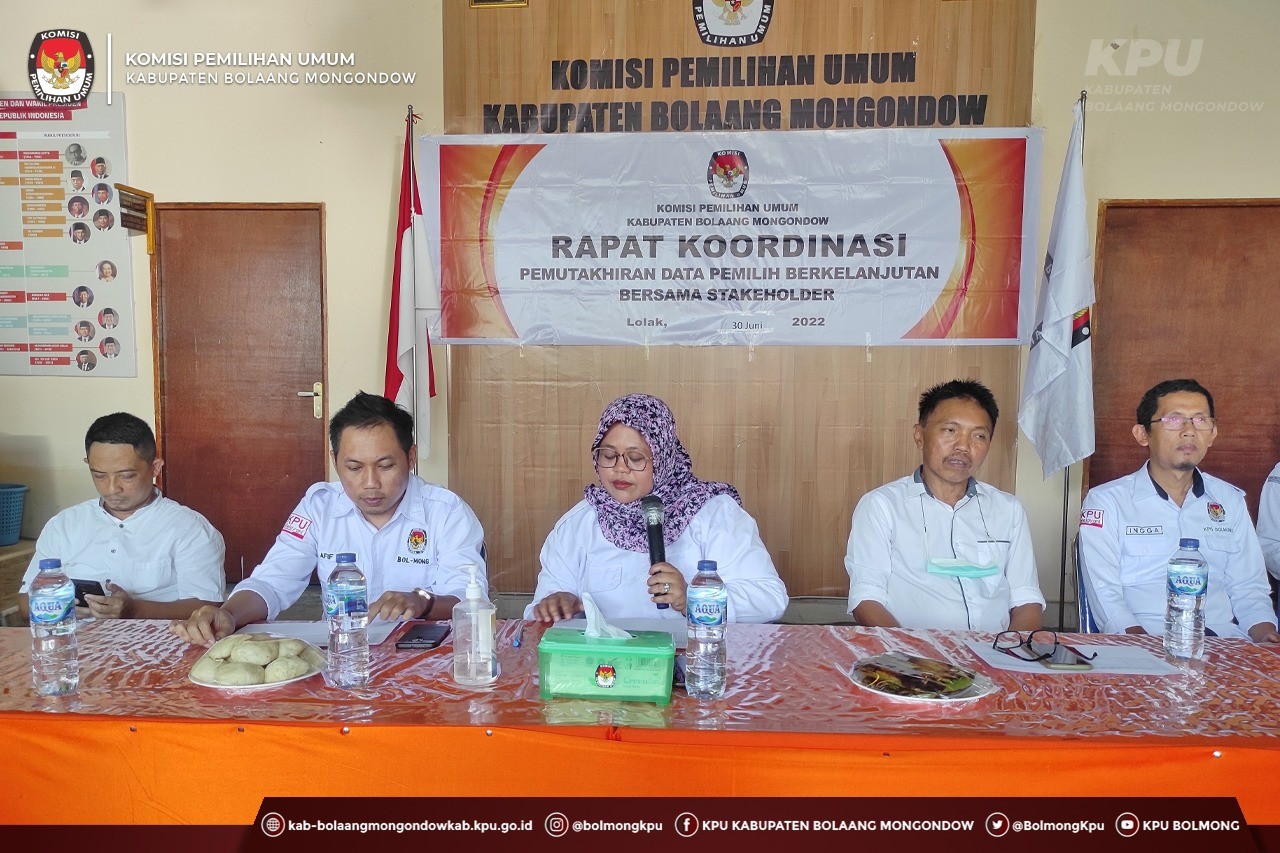 Lolak, kab-bolaangmongondow.kpu.go.id - Komisi Pemilihan Umum Kabupaten Bolaang Mongondow kembali melaksanakan Rapat Koordinasi Pemutakhiran Data Pemilih Berkelanjutan Bersama Stakeholder Tahun 2022 Periode Juni 2022 pada Kamis (30/06). Rapat Koordinasi ini dilaksanakan untuk memelihara, memperbaharui, dan mengevaluasi DPT Pemilu atau Pemilihan terakhir secara terus-menerus dan berkelanjutan yang digunakan untuk penyusunan DPT pada Pemilu dan/atau Pemilihan berikutnya. Adapun peserta yang hadir dalam kegiatan ini adalah Ketua dan Anggota KPU Kabupaten Bolaang Mongondow, Ketua Bawaslu Kabupaten Bolaang Mongondow, Dinas Kependudukan dan Pencatatan Sipil Kab. Bolaang Mongondow, Badan Kesatuan Bangsa dan Politik Kab. Bolaang Mongondow, Kodim 1303 Bolaang Mongondow, Polres Bolaang Mongondow, Kepala Desa/Sangadi Desa Lolak, Motabang dan Mongkoinit, Sekretaris KPU Kabupaten Bolaang Mongondow, Kasubbag Perencanaan, Data dan Informasi, Staf Sekretariat.