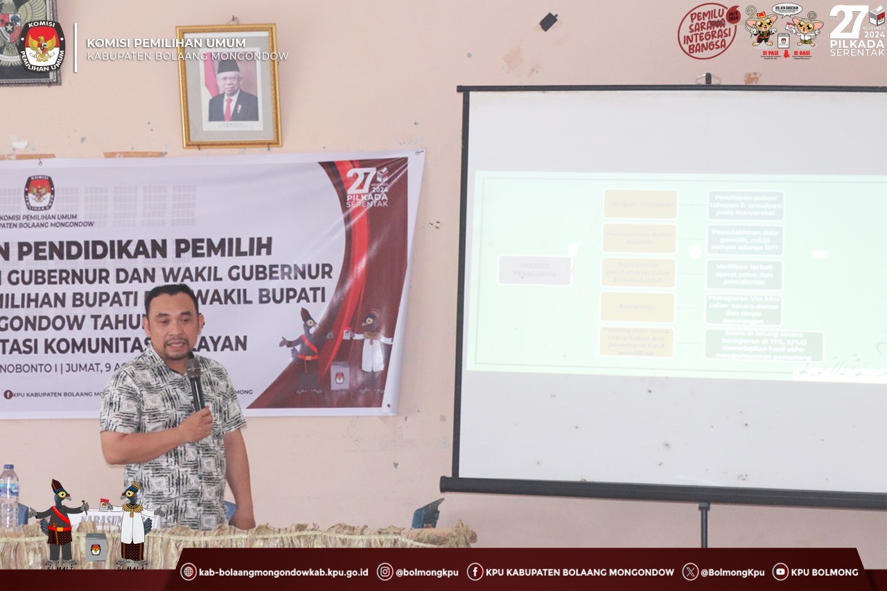 Pada kesempatannya, beliau menyampaikan bahwa KPU berkewajiban melaksanakan sosialisasi dan pendidikan kepada masyarakat sebagaimana diatur dalam Peraturan KPU Nomor 9 Tahun 2024, termasuk juga kepada Komunitas Nelayan yang merupakan salah satu mata pencaharian mayoritas masyarakat Bolmong di Kecamatan Bolaang dan Kecamatan Lolak, sehingga melalui giat ini dapat memberikan pengetahuan dan pemahaman mengenai proses dan tata cara teknis penyelenggaraan Pilkada 2024, serta dalam rangka meningkatkan penggunaan hak pilih masyarakat.