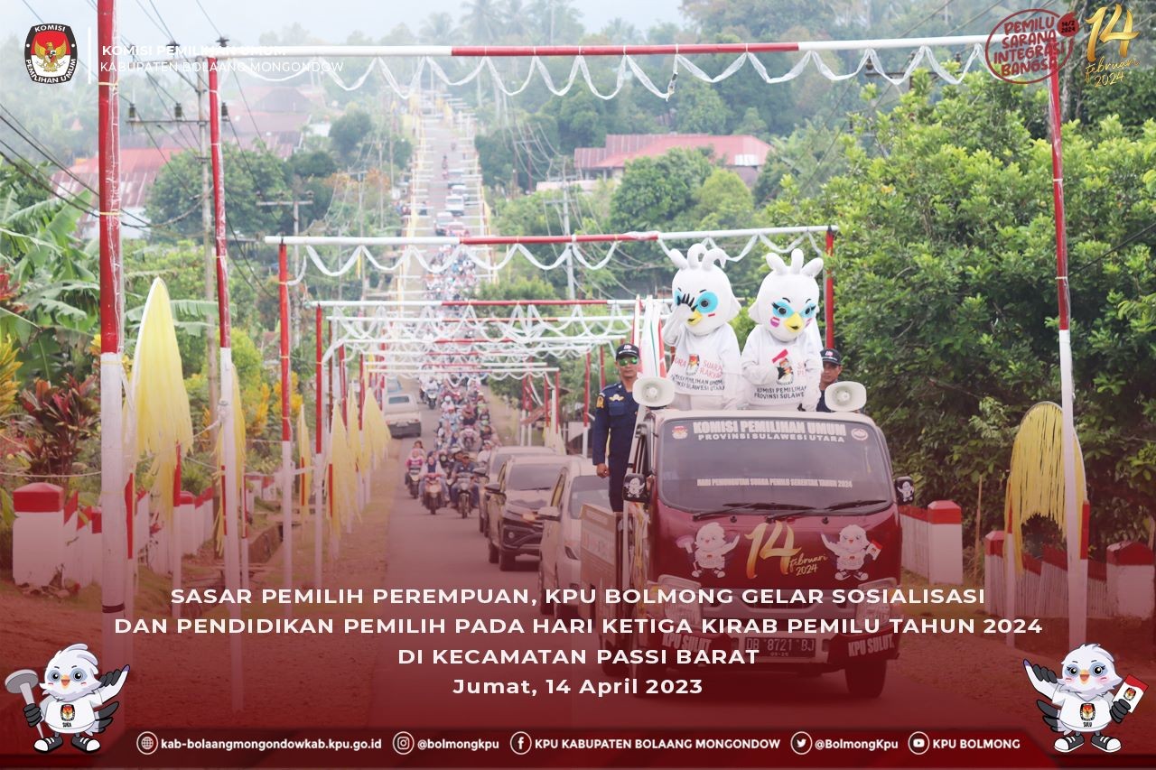 Lolak, kab-bolaangmongondow.kpu.go.id - Hari ketiga pelaksanaan Kirab Pemilu 2024 di Kabupaten Bolaang Mongondow diisi dengan kegiatan Sosialisasi dan Pendidikan Pemilih kepada Pemilih Perempuan di Kecamatan Passi Barat, Jumat (14/4).