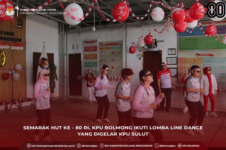 Lolak, kab-bolaangmongondow.kpu.go.id - Dalam rangka menyemarakkan HUT ke - 80 RI, KPU Kabupaten Bolaang Mongondow (Bolmong) mengikuti Lomba Line Dance yang digelar KPU Provinsi Sulut. Tim Line Dance KPU Bolmong mengikuti kegiatan ini secara daring.