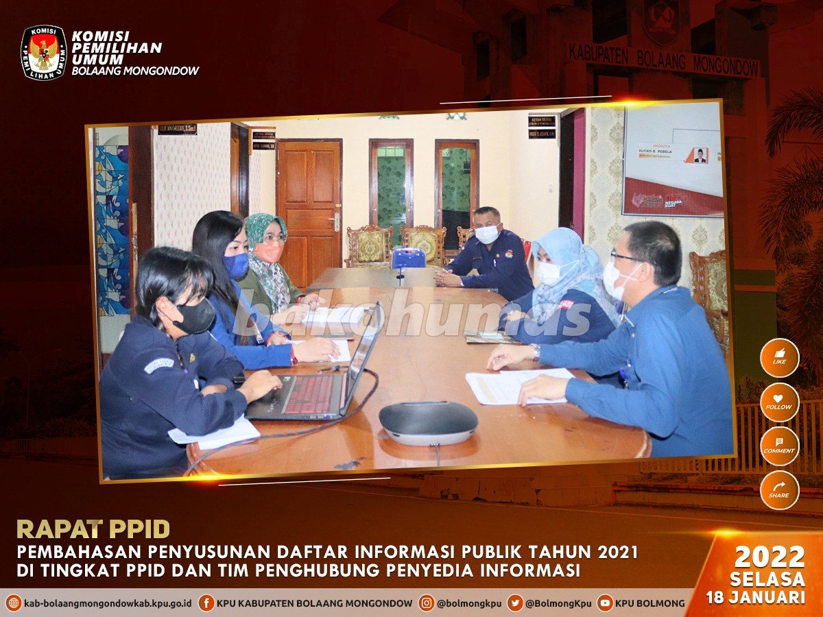 Lolak, Bolmong, kab-bolaangmongondow.kpu.go.id - Sebagai bentuk soliditas untuk mewujudkan keterbukaan informasi publik yang berkualitas sebagaimana amanat dalam Undang-Undang Nomor 14 Tahun 2008, maka PPID KPU Kabupaten Bolaang Mongondow kembali melaksanakan pembahasan penyusunan Daftar Informasi Publik (DIP) Tahun 2021 dengan melibatkan semua Kepala Sub Bagian selaku Tim Penghubung Penyedia Informasi dan Dokumentasi.