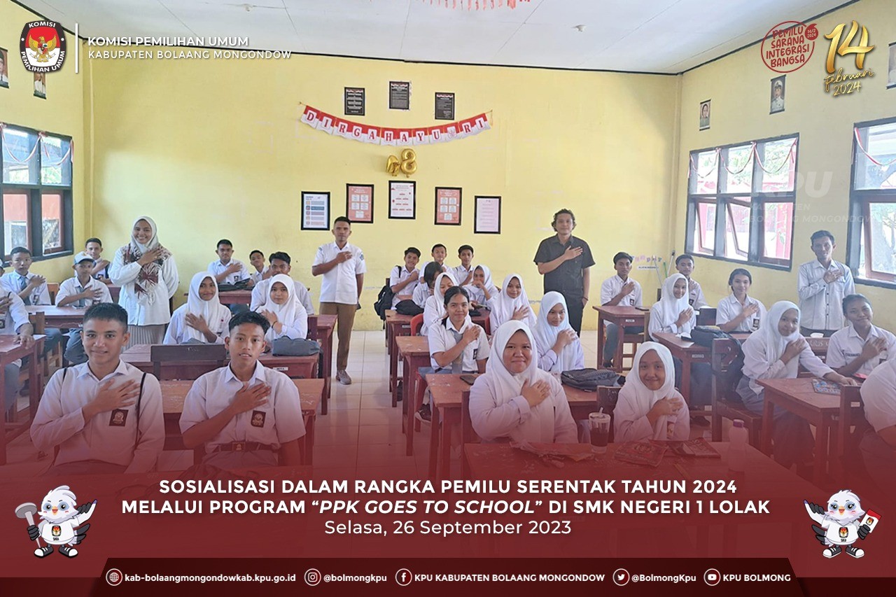 Memerhatikan Peraturan KPU Nomor 3 Tahun 2022 tentang Tahapan dan Jadwal Penyelengaraan Pemilihan Umum Tahun 2024, dan Peraturan KPU Nomor 9 Tahun 2022 tentang Partisipasi Masyarakat Dalam Pemilihan Umum dan Pemilihan Gubernur dan Wakil Gubernur, Bupati dan Wakil Bupati, dan/atau Walikota dan Wakil Walikota, KPU Bolmong melalui PPK Lolak melaksanakan sosialisasi kepada Siswa-Siswi di SMK Negeri 1 Lolak.